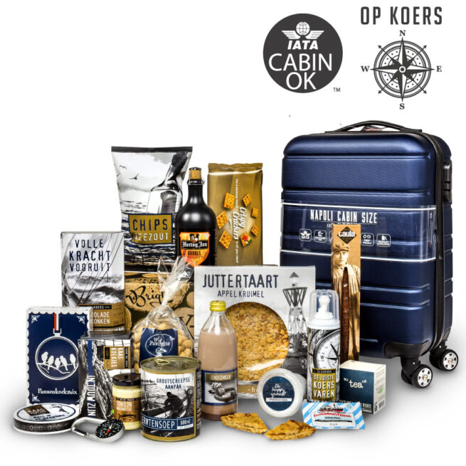 Dit stoere kerstpakket bevat naast allerlei heerlijke producten en prachtige trolley. Deze IATA goedgekeurde trolley mag met alle luchtvaartmaatschappijen mee als handbagage, ook bij Easyjet en Ryanair. De binnenkant van de trolley heeft een chique interieur met een divider. De trolley kenmerkt zich door een uniek design met horizontale banen aan de voor- en achterzijde, een stevig adreslabel, een cijferslot en 4 dubbele zachte wieltjes welke voorzien zijn van een geluiddempende functie op een harde ondergrond. Tevens zijn deze wieltjes 360 graden roteerbaar.