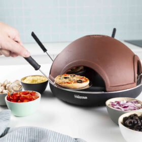 Maak samen met vrienden en familie de lekkerste mini pizza?s met uw eigen favoriete ingrediënten en deze stijlvolle Tristar Pizza Festa. Dankzij de handgemaakte kleikoepel bereikt de pizza-oven een hoge temperatuur wat ideaal is voor het heerlijk krokant bakken van de mini pizza?s. Dat wordt samen smikkelen en smullen.