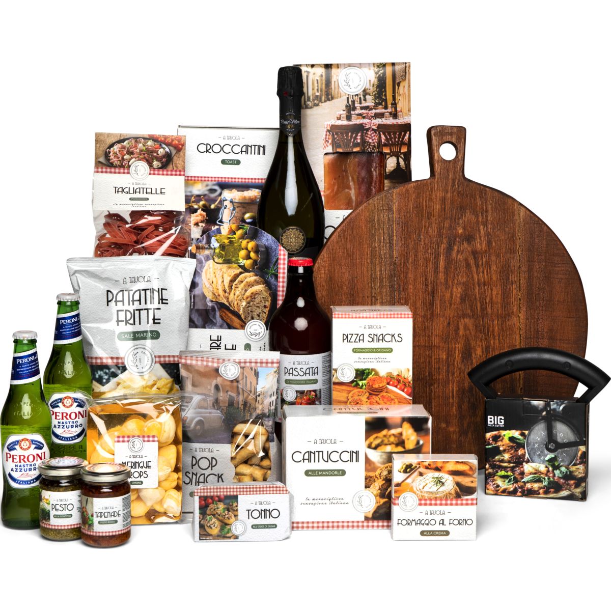 Haal Italië in huis met dit bomvolle, culinaire kerstpakket. Dat wordt genieten van heerlijke tagliatelle, of warm Mediterraans brood met tapenade of brie. Maar dit pakket bevat nog veel meer Italiaanse lekkernijen. Wat dacht u van een lekker koud biertje, of een goed glas prosecco met heerlijke Italiaanse snacks? U serveert de lekkernijen op de royale, stoere Le Bergier serveerplank.