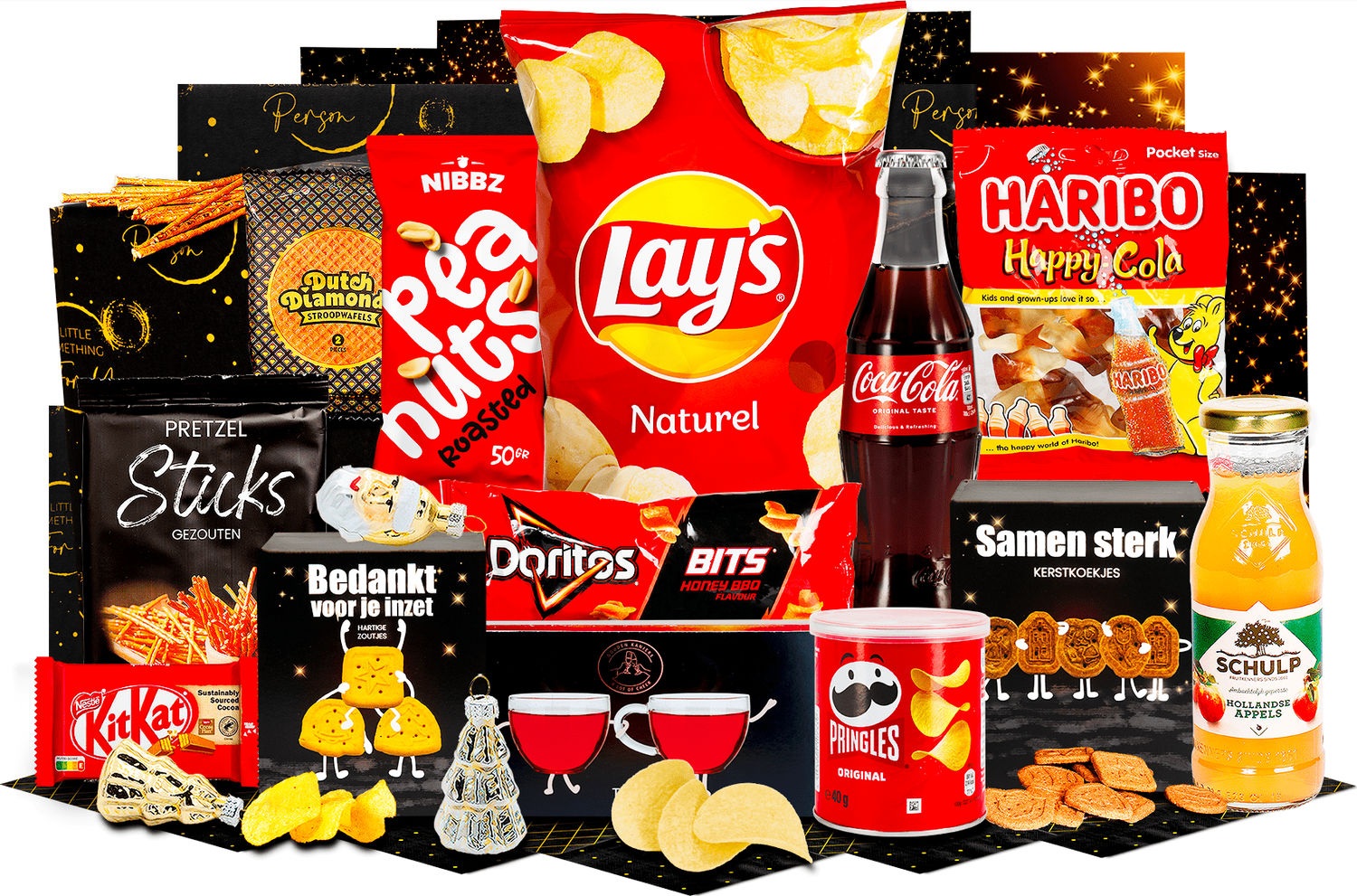 - Kersthanger in koker, 3 st, Coca cola regular fles, 0,2 ltr, Schulp appelsap, 0,2 ltr, Zwarte thee, 5 st, Hartige zoutjes peper-zeezout, 60 gr, Pretzels, 40 gr, Pinda's gezouten, 50 gr, Stroopwafel, 64 gr, 2 st, Kitkat, 41,5 gr, Haribo happy cola, 75gr, Pringles original, 40 gr, Lay's chips naturel, 100 gr, Doritos bits twisties honey bbq, 30 gr, Kerstkoekjes, 80 gr, Verpakt in feestelijke kerstdoos 31 x 20 x 14 cm