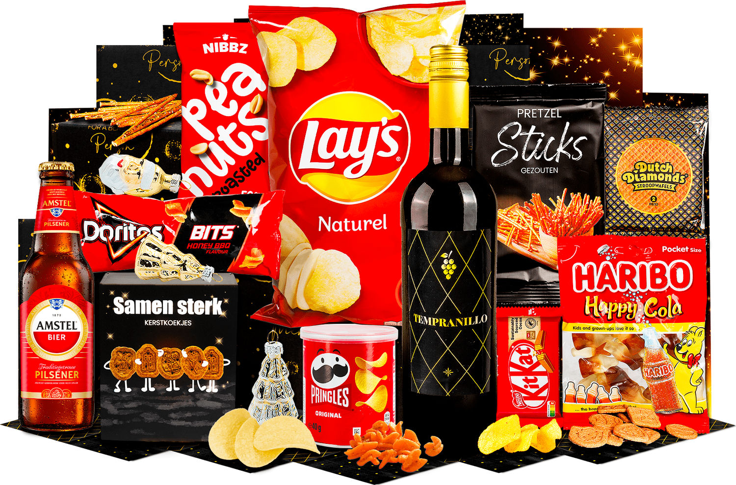 - Kersthanger in koker, 3 st, Rode wijn, Tempranillo, 0,75ltr, Bier, Amstel, 0,33 ltr, Pretzels, 40 gr, Pinda's gezouten, 50 gr, Stroopwafel, 64 gr, 2 st, Kitkat, 41,5 gr, Haribo happy cola, 75 gr, Pringles original, 40 gr, Lay's chips naturel, 100 gr,Doritos bits twisties honey bbq, 30 gr, Kerstkoekjes, 80 gr, Verpakt in feestelijke kerstdoos 31 x 20 x 14 cm