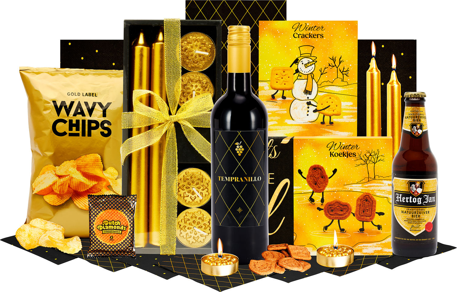 - Geschenkdoos met strik, 21 x 8,5 x 4 cm, Dinerkaarsen, 20 cm, 2 st, waxines, 4 st, Rode wijn, Tempranillo, 0,75ltr, Bier, Hertog Jan, 0,30 ltr, Hartige zoutjes peper-zeezout, 60 gr, Stroopwafel, 64 gr, 2 st, Ribbelchips, 90 gr, Kerstkoekjes, 80 gr, Verpakt in feestelijke kerstdoos 31 x 20 x 14 cm