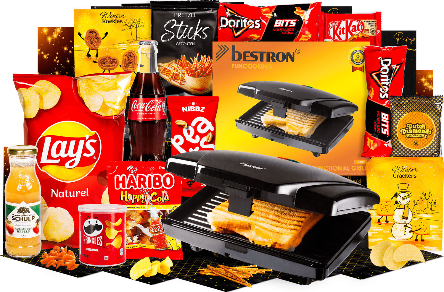 - Sandwich maker, 750w, Schulp appelsap, 0,2 ltr, Coca cola regular, fles, 0,2 ltr, Hartige zoutjes peper-zeezout, 60 gr, Pretzels, 40 gr, Pinda's gezouten, 50 gr, Stroopwafel, 64 gr, 2 st, Kitkat, 41,5 gr, Haribo happy cola, 75 gr, Pringles original,40 gr, Lay's chips naturel, 100 gr, Doritos bits twisties honey bbq, 30 gr, 2 st, Kerstkoekjes, 80 gr, Verpakt in feestelijke kerstdoos 39 x 29 x 17,5 cm