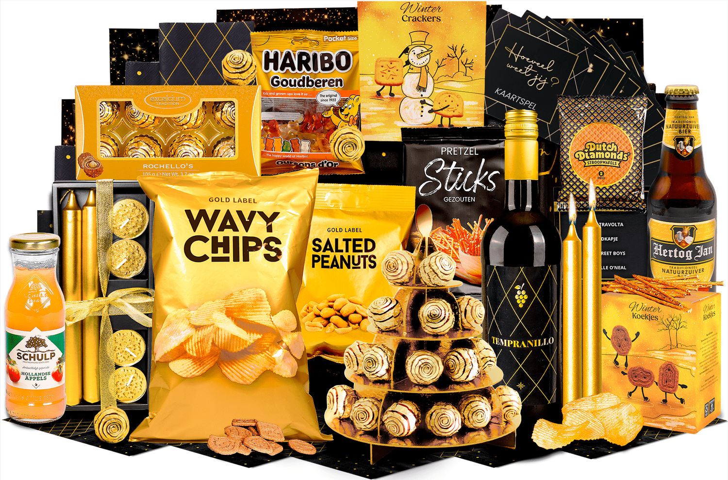 - Geschenkdoos met strik, 21 x 8,5 x 4 cm, Dinerkaarsen, 20 cm, 2 st, waxines, 4 st, Etagere Ø 20 cm, Kaartspel "Weet jij het?", Servetten, 8 st, Rode wijn, Tempranillo, 0,75ltr, Bier, Hertog Jan, 0,30 ltr, Schulp appelsap, 0,2 ltr, Richello's, 8 st, 100 gr, Hartige zoutjes peper-zeezout, 60 gr, Pretzels, 40 gr, Stroopwafel, 64 gr, 2 st, Haribo goudbeertjes, 75 gr, Pinda's zout, 100 gr, Ribbelchips, 90 gr, Kerstkoekjes, 80 gr, Verpakt in feestelijke kerstdoos 39 x 29 x 12,6 cm