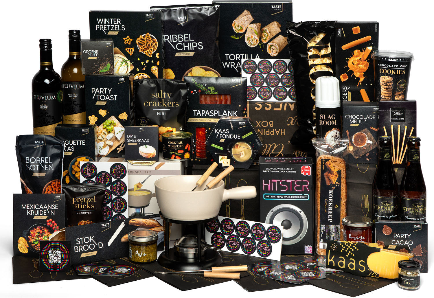 Dit bomvolle kerstpakket bevat naast allerlei smaakvolle producten het leuke partyspel Hitster. Met meer dan 300 van de grootste hits van de afgelopen 100 jaar is Hitster het perfecte partyspel voor een avond lachen, zingen dansen en het delen van herinneringen. Maak de doos open, scan een muziekkaart en laat de muziek de rest doen om er een feestje van te maken. Dus waar wacht je nog op. Nodig je vrienden uit voor een avondje plezier en ontdek wie uitgeroepen wordt tot Hitster. Met de grote fondueset maak je elk moment extra gezellig. Smelt heerlijke kaas of chocolade voor in een pan of zet de bijgeleverde pan op het gasfornuis. Vervolgens kan de pan op de houder worden gezet en wordt het warm gehouden door de fonduebrander. De set bevat een ruime fonduepan, een onderstel met fonduebrander en doof deksel en vier vorkjes met houten handgreep.