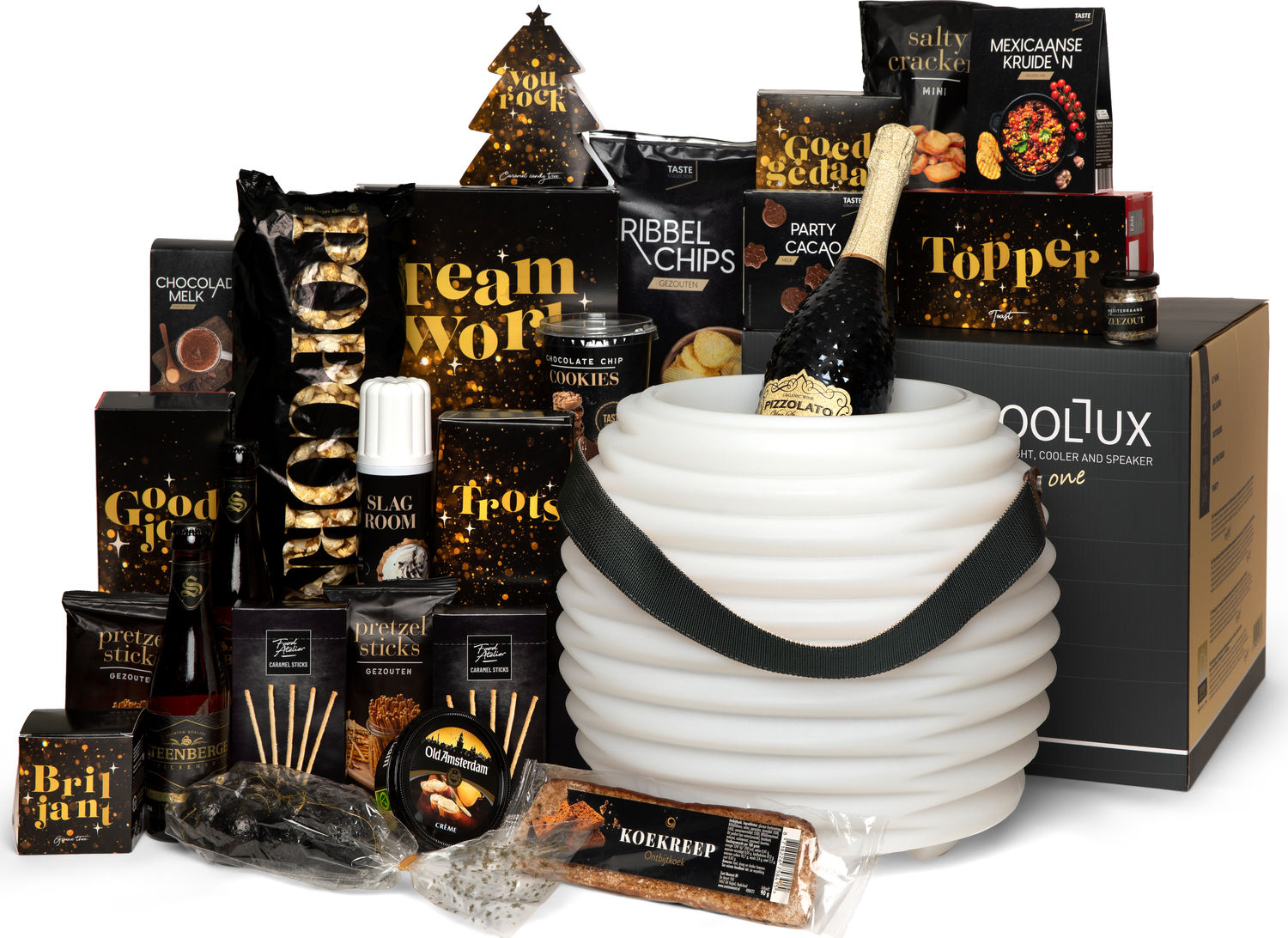 Ontdek een luxe cadeaumand perfect voor elk feestelijk moment. Deze zorgvuldig samengestelde set bevat een scala aan smaakvolle lekkernijen die zorgen voor een ongeëvenaarde culinaire ervaring. De elegante presentatiemand is ontworpen met oog voor detail en biedt een veelzijdige selectie van snacks en dranken. Ideaal voor het creëren van een gezellige sfeer tijdens speciale gelegenheden. Verrijk uw feest of evenement met deze stijlvolle traktatie, perfect om te delen met vrienden en familie. Eensmaakvolle keuze die gegarandeerd indruk maakt.
