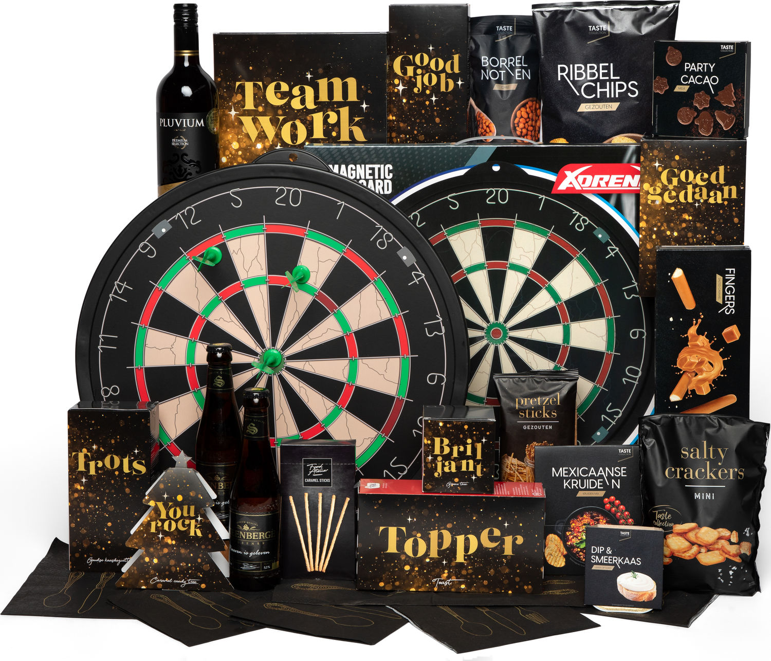 Deze luxe cadeauset biedt alles voor een gezellige avond met vrienden of familie. Centraal staan twee hoogwaardige dartborden, ideaal voor een spannende en vermakelijke competitie. De set wordt verder verrijkt met een selectie van smaakvolle delicatessen, waaronder diverse chips en crackers die perfect combineren met het aanbod van verfrissende dranken. Voor liefhebbers van pittigheid is er een selectie kruiden en sauzen die elke snack naar een hoger niveau tillen. Dit pakket combineert ontspanning en plezier met culinaire verrassingen, waardoor het een perfecte keuze is voor feestelijke gelegenheden of als geschenk voor een speciale gelegenheid.
