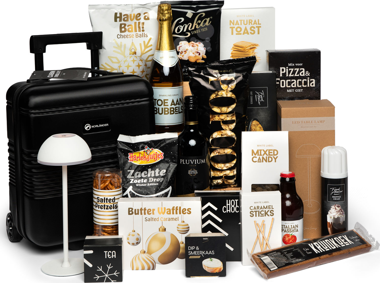De ontvanger van dit pakket zal zeker in zn nopjes zijn. Naast een luxe trolley en een sfeervol lampje bevat dit pakket smaakvolle producten. Deze trendy lamp is oplaadbaar en door het stijlvolle ontwerp geschikt voor iedere plek in huis. De lamp isop te laden middels de bijgeleverde USB-C kabel. Schakel de lamp in met het knopje aan de onderkant. Tik op de bovenkant van de lamp om te switchen tussen wit licht en warm licht. Houd de bovenkant langer ingedrukt om het licht te dimmen en weer feller te maken. De compacte trolley is speciaal gemaakt om onder de stoel in het vliegtuig te passen. Hierdoor mag deze trolley mee als handbagage bij alle luchtvaartmaatschappijen. De trolley heeft een uitschuifbare stang en twee luxe soft wieltjes. Debinnenzijde bestaat uit een hoofdcompartiment met buckles en een ritsvak.