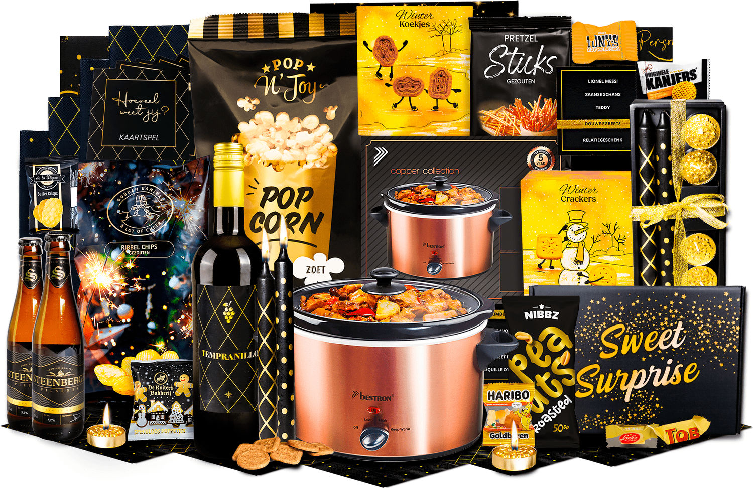 - Slowcooker koper, 1,5l, 120 Watt, Geschenkdoos met strik, 21 x 8,5 x 4 cm, Dinerkaarsen, 20 cm, 2 st, waxines, 4 st, Kaartspel "Weet jij het?", Servetten, 8 st, Rode wijn, Tempranillo, 0,75ltr, Bier, Steenberge, 0,25 ltr, 2 st, Hartige zoutjes peper-zeezout, 60 gr, Pretzels, 40 gr, Popcorn, 70 gr, Pinda's gezouten, 50 gr, Ribbelchips gezouten, 90 gr, Kerstkoekjes, 80 gr, Sweet box inhoud:, Geschenkdoos Sweetbox, 16 x 23 x 2,5 cm, De la Digue boterwafels, 10 gr, 3st, Kanjers mini stroopwafels, 8gr, De ruiter speculoos koekjes, 25 gr, Haribo goudbeertjes zakje, 10 gr, Lonka nougat caramel, 12 gr, Tiny tony chocolonely puur, mini, Toblerone, mini*, Verpakt in feestelijke kerstdoos 39 x 29 x 23,2 cm