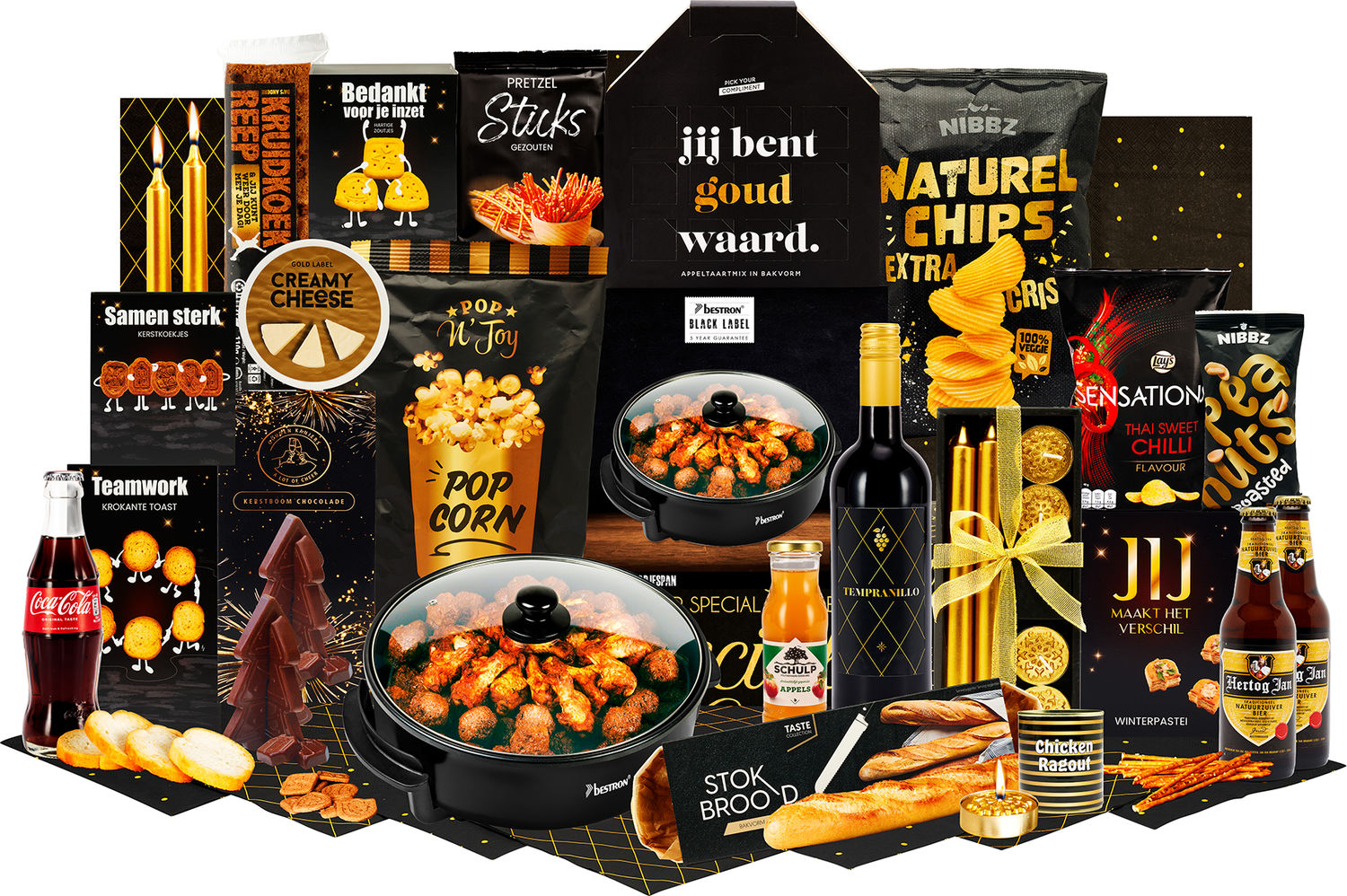- Electrische hapjespan, 30 cm, 1500 Watt, Geschenkdoos met strik, 21 x 8,5 x 4 cm, Dinerkaarsen, 20 cm, 2 st, waxines, 4 st, Rode wijn, Tempranillo, 0,75ltr, Bier, Hertog Jan, 0,30 ltr, 2 st, Coca cola regular, fles, 0,2 ltr, Schulp appelsap, 0,2 ltr,Melkchocolade kerstboom, 90 gr, Pasteitjes kerstklok, 100 gr, Hartige zoutjes peper-zeezout, 60 gr, Krokante toast, 75 gr, Pretzels, 40 gr, Koekreep, 110 gr, Popcorn, 70 gr, Pinda's gezouten, 50 gr, Ribbelchips gezouten, 90 gr, Stokbrood in bakvorm,200 gr, Appeltaartmix in bakvorm, 300 gr, Kaaspuntjes, 125 gr, Ragout kip, 290 gr, Lay's sensations thai sweet chilli, 40 gr, Kerstkoekjes, 80 gr, Verpakt in feestelijke kerstdoos 45 x 35 x 23 cm