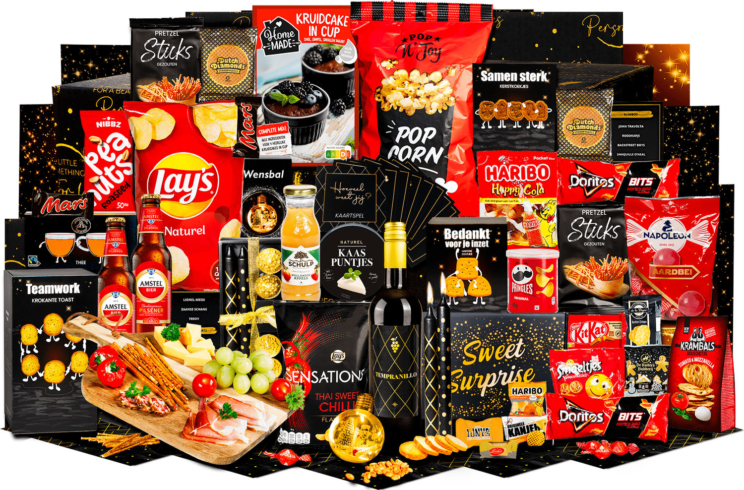 - Snijplank acaciahout, 34 x 20,5 cm, Geschenkdoos met strik, 21 x 8,5 x 4 cm, Dinerkaarsen, 20 cm, 2 st, waxines, 4 st, Kaartspel "Weet jij het?", Wensbal, Rode wijn, Tempranillo, 0,75ltr, Bier, Amstel, 0,33 ltr, 2 st, Schulp appelsap, 0,2 ltr, Zwartethee, 5 st, Hartige zoutjes peper-zeezout, 60 gr, Krokante toast, 75 gr, Pretzels, 40 gr, 2 st, kruidcake in a cup, 280 gr, Popcorn, 70 gr, Pinda's gezouten, 50 gr, Stroopwafel, 64 gr, 4 st, Napoleon aardbeikogels, 80 gr, Mars mini, 18 gr, 2 st, Kitkat, 41,5 gr, Haribo happy cola, 75 gr, Pringles original, 40 gr, Lay's chips naturel, 100 gr, Smoeltjes, 25 gr, Kaaspuntjes, 125 gr, Lay's sensations thai sweet chilli, 40 gr, Doritos bits twisties honey bbq, 30 gr, 2 st, Bruschetta tomato & mozzarella, 70 gr, Kerstkoekjes, 80 gr, Sweet box inhoud:, Geschenkdoos Sweetbox, 16 x 23 x 2,5 cm, De la Digue boterwafels, 10 gr, 3st, Kanjers mini stroopwafels, 8 gr, De ruiter speculoos koekjes, 25 gr, Haribo goudbeertjes zakje, 10 gr, Lonka nougat caramel, 12 gr, Tiny tony chocolonely puur, mini, Toblerone, mini*, Verpakt in feestelijke kerstdoos 39 x 29 x 17,5 cm