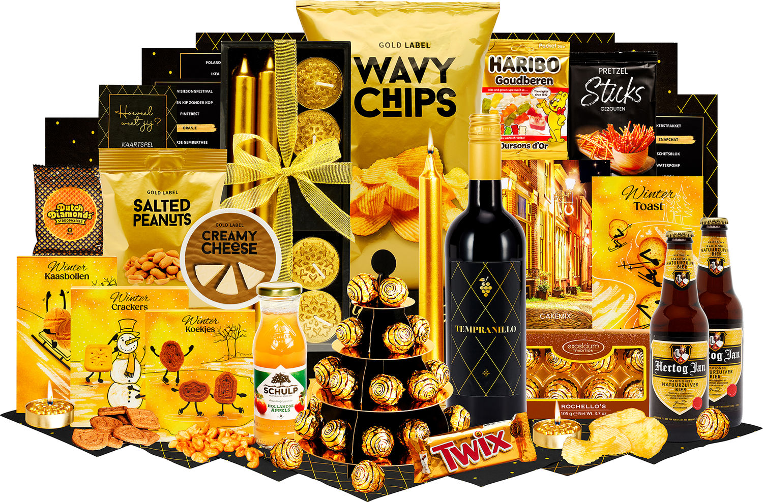 - Geschenkdoos met strik, 21 x 8,5 x 4 cm, Dinerkaarsen, 20 cm, 2 st, waxines, 4 st, Etagere Ø 20 cm, Kaartspel "Weet jij het?", Servetten, 8 st, Rode wijn, Tempranillo, 0,75ltr, Bier, Hertog Jan, 0,30 ltr, 2 st, Schulp appelsap, 0,2 ltr, Richello's 8st, 100 gr, Hartige zoutjes peper-zeezout, 60 gr, Kaaswafelbolletjes, 50 gr, Krokante toast, 75 gr, Pretzels, 40 gr, Cake bakmix, 350 gr, Stroopwafel, 64 gr, 2 st, Haribo goudbeertjes, 75 gr, Pinda's zout, 100 gr, Kaaspuntjes, 125 gr, Ribbelchips, 90gr, Twix, 50 gr, Kerstkoekjes, 80 gr, Verpakt in feestelijke kerstdoos 39 x 29 x 12,6 cm