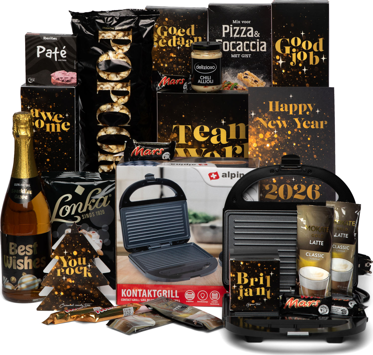 Deze feestelijke geschenkset is perfect samengesteld voor een onvergetelijke jaarwisseling. De set biedt een scala aan luxe lekkernijen en praktische items die samenkomen om een sfeervolle en smakelijke ervaring te creëren. Geniet van een mix van zoete en hartige hapjes, van premium chocolade tot ambachtelijke delicatessen, ideaal voor een gezellige avond met vrienden of familie. Een stijlvolle fles mousserende drank voegt een sprankje elegantie toe aan elke gelegenheid. Daarnaast bevat de set een handige contactgrill, perfect voor het bereiden van warme snacks. Deze geschenkset is een ideale keuze voor iedereen die houdt van genieten en het nieuwe jaar in stijl wil vieren.