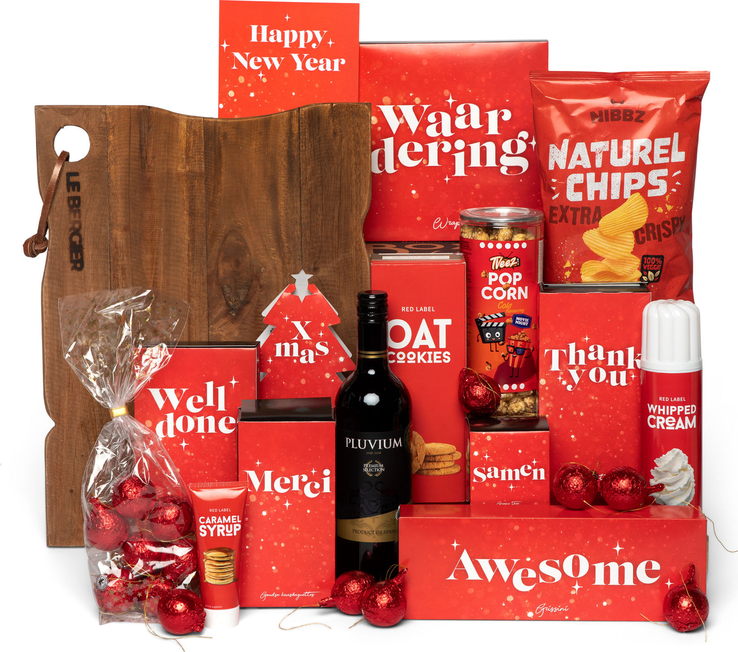 De luxueuze selectie van lekkernijen en sfeervolle items is zorgvuldig samengesteld om te genieten tijdens feestelijke gelegenheden. Een elegante fles wijn voegt een verfijnd tintje toe, terwijl knapperige snacks en zoete lekkernijen voor een diversiteit aan smaak zorgen. De volledig rode en goudkleurige verpakking geeft een feestelijke uitstraling, ideaal als een attent en smaakvol cadeau voor vrienden, familie of collega's. Het hele pakket ademt de feestelijke sfeer van nieuwjaar uit en nodigt uit tot delen en genieten.