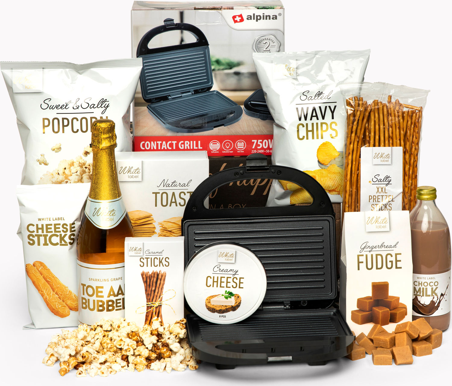 Dit trendy witte kerspakket bevat allerlei smaakvolle producten die goed van pas komen tijdens een gezellige avond. De Alpina contactgrill is geschikt om 2 heerlijke tosti's per keer te bakken. Hier zal de ontvanger nog lang van genieten.