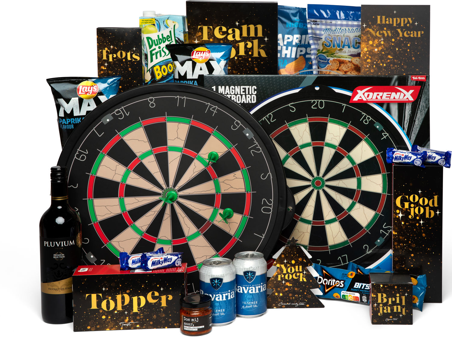 Trakteer op gezelligheid en speelplezier met dit originele kerstpakket vol sfeer en uitdaging. Met een magnetisch dartbord als eyecatcher en een selectie aan lekkere snacks en drankjes is dit het perfecte cadeau voor een ontspannen en leuke avond thuis. Een pakket dat gegarandeerd in de roos is!