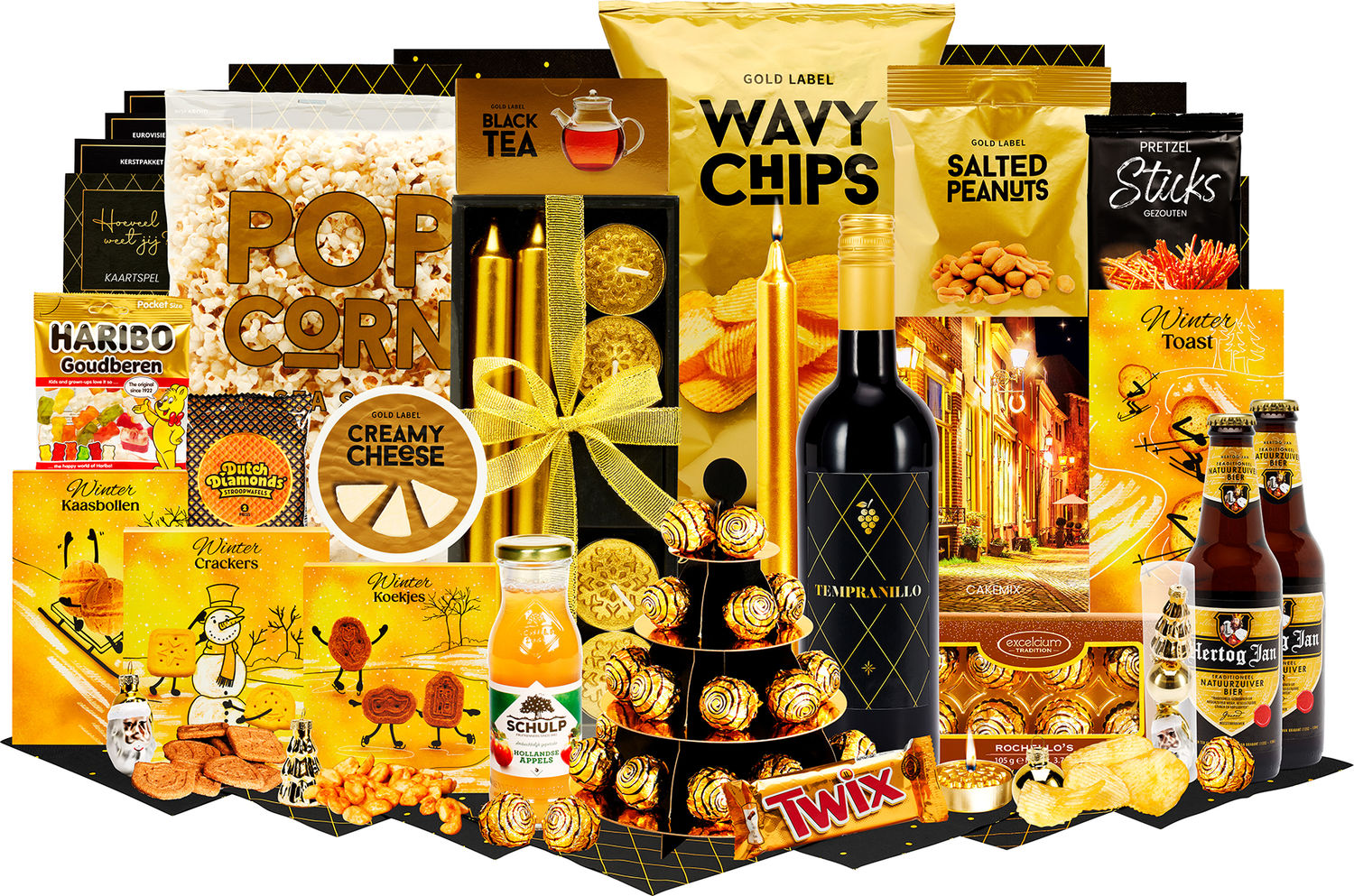 - Geschenkdoos met strik, 21 x 8,5 x 4 cm, Dinerkaarsen, 20 cm, 2 st, waxines, 4 st, Etagere Ø 20 cm, Kersthanger in koker, 3 st, Kaartspel "Weet jij het?", Servetten, 8 st, Rode wijn, Tempranillo, 0,75ltr, Bier, Hertog Jan, 0,30 ltr, 2 st, Richello's,8 st, 100 gr, Hartige zoutjes peper-zeezout, 60 gr, Kaaswafelbolletjes, 50 gr, Krokante toast, 75 gr, Pretzels, 40 gr, Schulp appelsap, 0,2 ltr, Cake bakmix, 350 gr, Stroopwafel, 64 gr, 2 st, Haribo goudbeertjes, 75 gr, Pinda's zout, 100 gr, Kaaspuntjes, 125 gr, Popcorn zout, 100 gr, Ribbelchips, 90 gr, Zwarte thee, 20 st, Twix, 50 gr, Kerstkoekjes, 80 gr, Verpakt in feestelijke kerstdoos 39 x 29 x 17,5 cm