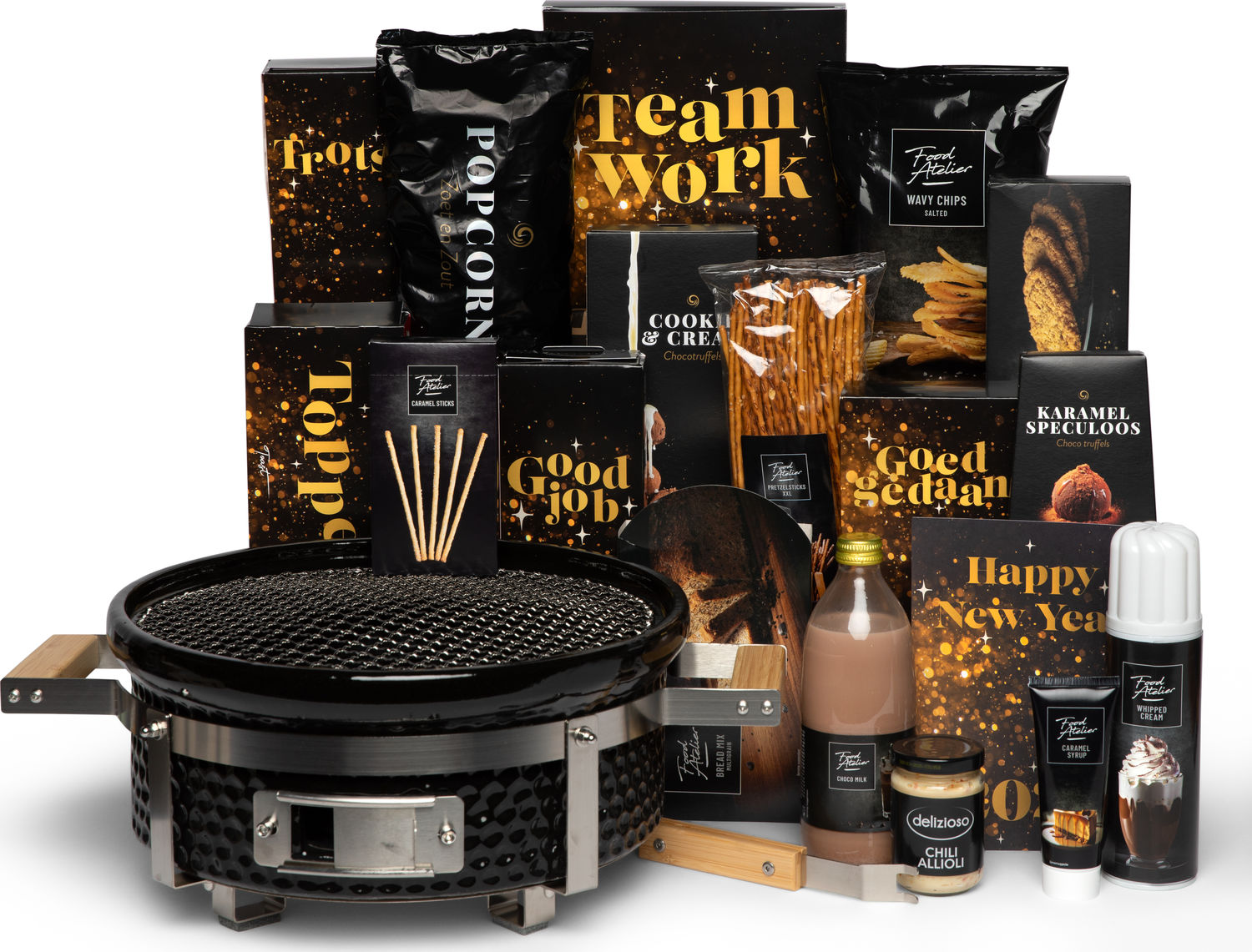 Deze luxe cadeau- en grillset is perfect voor liefhebbers van culinaire avonturen en gezellige momenten. De hoogwaardige barbecue biedt een veelzijdige kookervaring, ideaal voor zowel intieme diners als feestelijke bijeenkomsten. Om de culinaire ervaring te verrijken, bevat de set een selectie van verfijnde snacks en zoetigheden, zorgvuldig samengesteld om te genieten van uiteenlopende smaken. De stijlvolle verpakking, met een verfijnde zwarte en gouden uitstraling, maakt het een indrukwekkend cadeau om te geven of te ontvangen. Ideaal voor feestdagen of speciale gelegenheden, deze set belooft onvergetelijke smaken en momenten.
