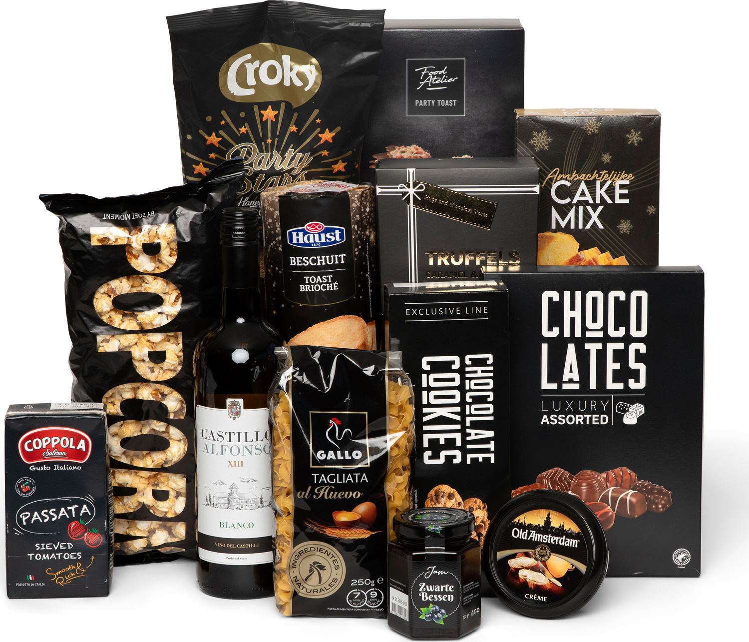 Het is party time met dit leuke snack pakket. Geniet samen met vrienden of familie van de lekkerste producten uit dit leuke pakket.