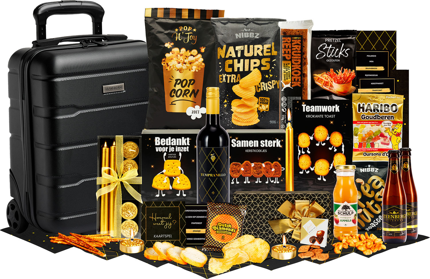 - Trolley, 30 x 40 x 20 cm, Geschenkdoos met strik, 21 x 8,5 x 4 cm, Dinerkaarsen, 20 cm, 2 st, waxines, 4 st, Kaartspel "Weet jij het?", Rode wijn, Tempranillo, 0,75ltr, Bier, Steenberge, 0,25 ltr, 2 st, Schulp appelsap, 0,2 ltr, Hartige zoutjes peper-zeezout, 60 gr, Krokante toast, 75 gr, Pretzels, 40 gr, Luxe praline collection, 100 gr, Koekreep, 110 gr, Popcorn, 70 gr, Pinda's gezouten, 50 gr, Ribbelchips gezouten, 90 gr, Stroopwafel, 64 gr, 2 st, Haribo goudbeertjes, 75 gr, Kerstkoekjes, 80 gr, Verpakt in feestelijke kerstdoos 45 x 35 x 23 cm