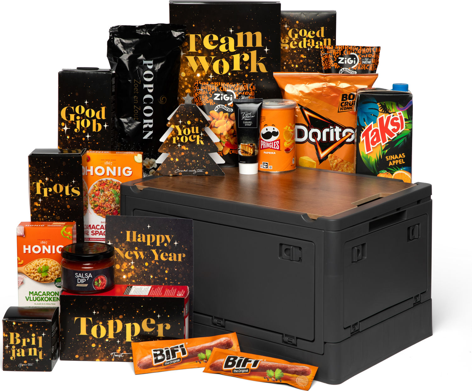 Niets zegt "bedankt" en "fijne feestdagen" zoals dit stijlvolle kerstpakket. Met zijn luxe uitstraling en motiverende teksten als "Team Work" en "Good Job" is het niet alleen een traktatie voor de smaakpapillen, maar ook een blijk van waardering. De elegante zwarte dozen met gouden accenten maken het uitpakken tot een feest op zich. Of je nu een collega wilt verrassen of een geliefde wilt verwennen, dit pakket brengt gegarandeerd een glimlach en een moment van gezelligheid. Een perfecte mix van genieten en waarderen – precies wat de feestdagen nodig hebben.