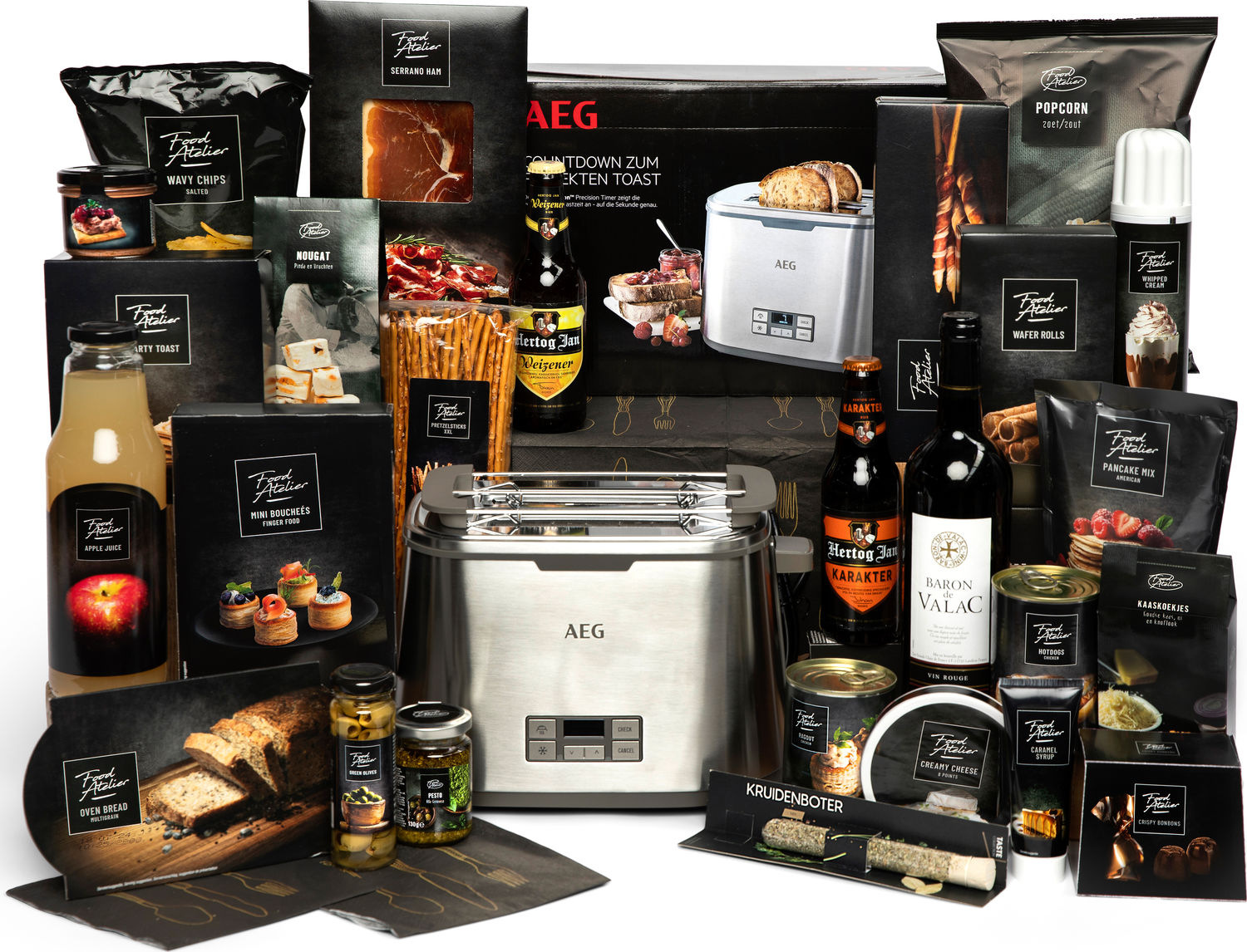Heerlijk goudbruin geroosterd brood, met een knapperige korst, precies zoals jij het wil. Met de AEG Premiumline broodrooster bereid jij de perfecte geroosterde boterham, iedere dag weer. Dankzij de check & lift functie kun je tussentijds kijken of het brood al klaar is, zonder het roosteren te onderbreken. En past het brood niet in de extra brede sluif? Geen probleem. Met de inklapbare verwarmer trakteer jij altijd op warme broodjes. Ook het opruimen van kruimels is een eitje, je houdt hem gemakkelijk schoon door de verwijderbare kruimellade. Food Atelier is de proefkeuken van waaruit allerlei smaakvolle producten worden ontwikkeld. Pannenkoeken met stroop, rustiek brood met pesto, chocomel met slagroom, je vindt het allemaal in dit rijk gevulde culinaire kerstpakket.