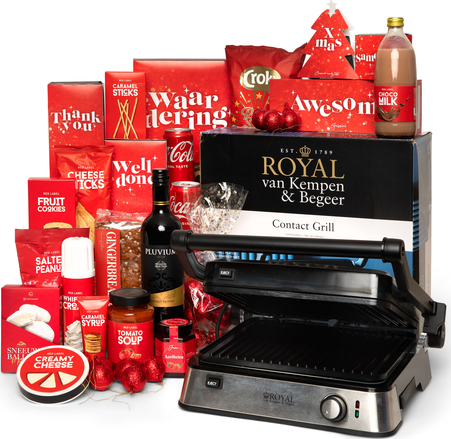 Deze feestelijke geschenkdoos is perfect voor elke gelegenheid en biedt een luxueuze culinaire ervaring. Gevuld met een variëteit aan verwennerijen, brengt het een warme sfeer in elk huishouden. De hoogwaardige contactgrill vormt het middelpunt, ideaal voor het bereiden van smakelijke gerechten. Omringd door een selectie van delicatessen, is dit pakket ontworpen om te verrassen en te verheugen. Het strakke en stijlvolle ontwerp van de grill maakt het een geweldige toevoeging aan elke keuken en garandeert jarenlang kookplezier. Ideaal voor wie op zoek is naar een uniek en luxe cadeau.