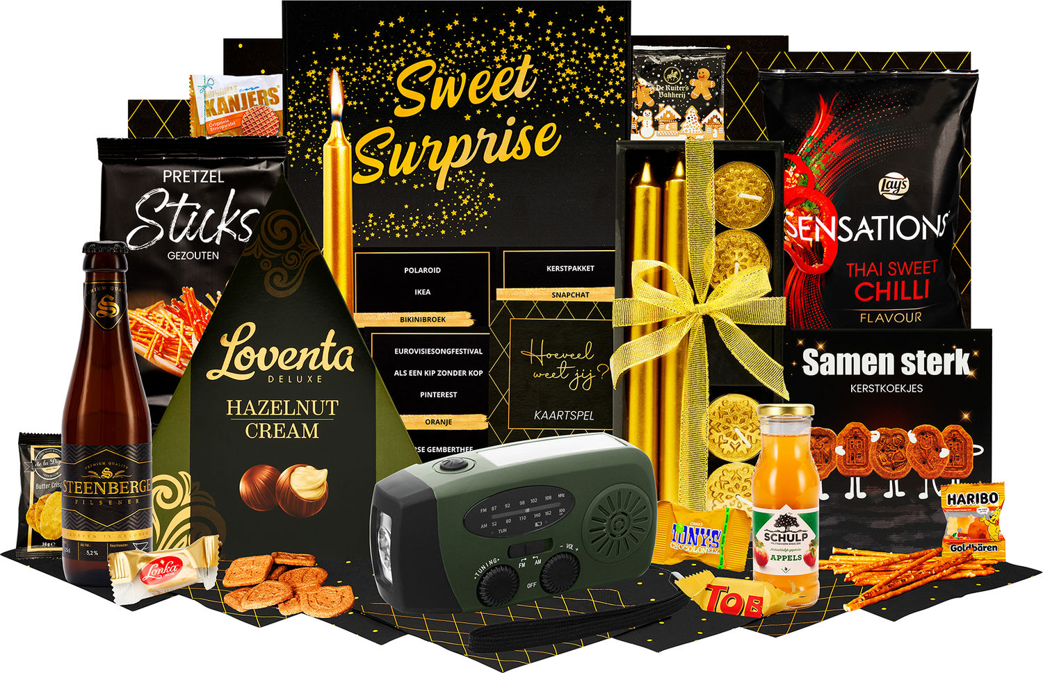 - Nood radio, zaklamp, speaker, Geschenkdoos met strik, 21 x 8,5 x 4 cm, Dinerkaarsen, 20 cm, 2 st, waxines, 4 st, Kaartspel "Weet jij het?", Servetten, 8 st, Bier, Steenberge, 0,25 ltr, Schulp appelsap, 0,2 ltr, Chocolade hazelnoot pralines, 110 gr, Lay's sensations thai sweet chilli, 40 gr, Pretzels, 40 gr, Kerstkoekjes, 80 gr, Sweet box inhoud:, Geschenkdoos Sweetbox, 16 x 23 x 2,5 cm, De la Digue boterwafels, 10 gr, 3st, Kanjers mini stroopwafels, 8 gr, De ruiter speculoos koekjes, 25 gr, Haribo goudbeertjes zakje, 10 gr, Lonka nougat caramel, 12 gr, Tiny tony chocolonely puur, mini, Toblerone, mini*, Verpakt in feestelijke kerstdoos 39 x 29 x 12,6 cm