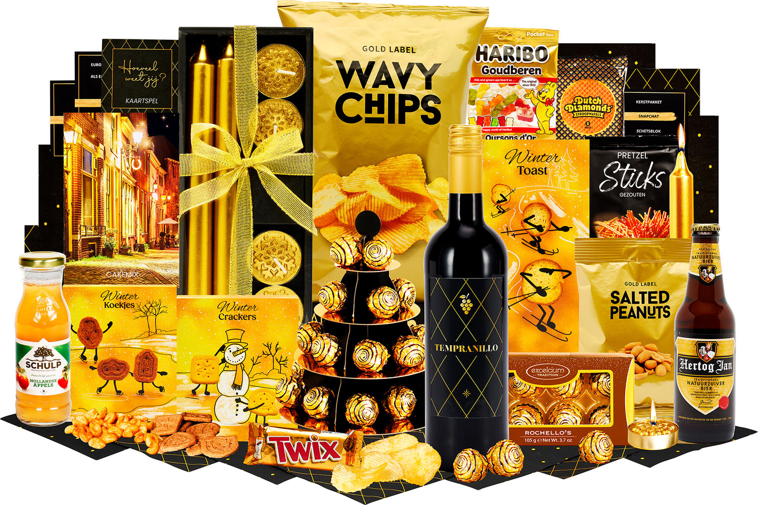 - Geschenkdoos met strik, 21 x 8,5 x 4 cm, Dinerkaarsen, 20 cm, 2 st, waxines, 4 st, Etagere Ø 20 cm, Kaartspel "Weet jij het?", Servetten, 8 st, Rode wijn, Tempranillo, 0,75ltr, Bier, Hertog Jan, 0,30 ltr, Schulp appelsap, 0,2 ltr, Richello's, 8 st, 100 gr, Hartige zoutjes peper-zeezout, 60 gr, Krokante toast, 75 gr, Pretzels, 40 gr, Cake bakmix, 350 gr, Stroopwafel, 64 gr, 2 st, Haribo goudbeertjes, 75 gr, Pinda's zout, 100 gr, Ribbelchips, 90 gr, Twix, 50 gr, Kerstkoekjes, 80 gr, Verpakt in feestelijke kerstdoos 39 x 29 x 12,6 cm