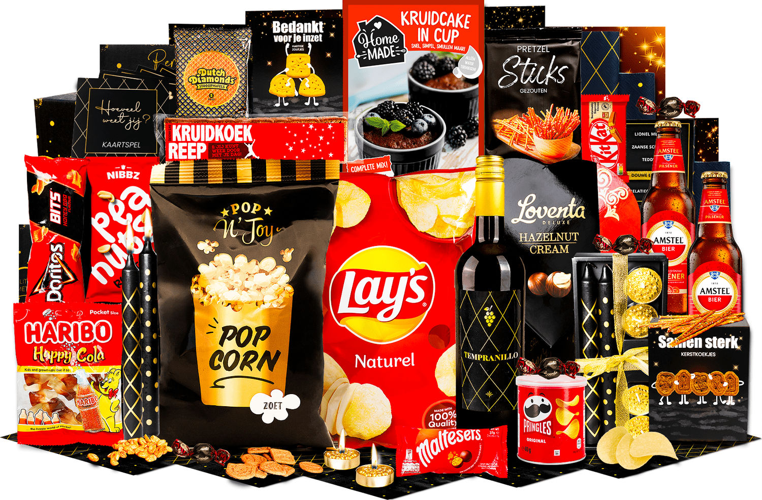 - Geschenkdoos met strik, 21 x 8,5 x 4 cm, Dinerkaarsen, 20 cm, 2 st, waxines, 4 st, Kaartspel "Weet jij het?", Servetten, 8 st, Rode wijn, Tempranillo, 0,75ltr, Bier, Amstel, 0,33 ltr, 2 st, Hartige zoutjes peper-zeezout, 60 gr, Pretzels, 40 gr, kruidcake in a cup, 280 gr, Koekreep, 110 gr, Chocolade hazelnoot pralines, 110 gr, Popcorn, 70 gr, Pinda's gezouten, 50 gr, Stroopwafel, 64 gr, 2 st, Kitkat, 41,5 gr, Haribo happy cola, 75 gr, Pringles original, 40 gr, Lay's chips naturel, 100 gr, Doritos bits twisties honey bbq, 30 gr, Maltesers, 37 gr, Kerstkoekjes, 80 gr, Verpakt in feestelijke kerstdoos 39 x 29 x 12,6 cm