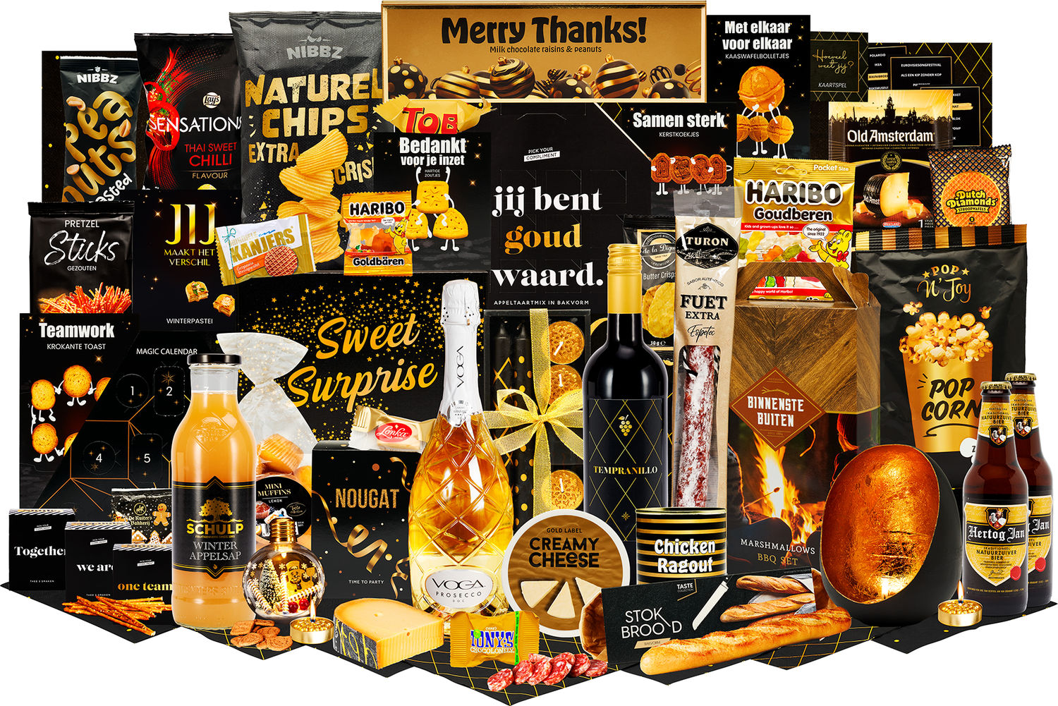 - Geschenkdoos met strik, 21 x 8,5 x 4 cm, Dinerkaarsen, 20 cm, 2 st, waxines, 4 st, Kaarsenhouder, 10 x 13 cm, Kaartspel "Weet jij het?", Servetten, 8 st, Wensbal, Prosecco, Voga, 0,75 ltr, Rode wijn, Tempranillo, 0,75ltr, Bier, Hertog Jan, 0,30 ltr,2 st, Schulp appelsap, 0,75 ltr, Pasteitjes kerstklok, 100 gr, Hartige zoutjes peper-zeezout, 60 gr, Kaaswafelbolletjes, 50 gr, Fuet worst, 150 gr, Krokante toast, 75 gr, Pretzels, 40 gr, Marshmallows bbq set, 250 gr, Popcorn, 70 gr, Pinda's gezouten, 50 gr, Ribbelchips gezouten, 90 gr, Stroopwafel, 64 gr, 2 st, Haribo goudbeertjes, 75 gr, Mini muffins, 200 gr, Stokbrood in bakvorm, 200 gr, Choco magic calendar, 75 gr, Thee selectie 3 smaken, 3 st, Appeltaartmix in bakvorm, 300 gr, Kaaspuntjes,125 gr, Chocoreep pinda, 225 gr, Ragout kip, 290 gr, Nougat, 100 gr, Lay's sensations thai sweet chilli, 40 gr, Old amsterdam wigstuk, 150 gr, Kerstkoekjes, 80 gr, Sweet box inhoud:, Geschenkdoos Sweetbox, 16 x 23 x 2,5 cm, De la Digue boterwafels, 10 gr, 3st, Kanjers mini stroopwafels, 8 gr, De ruiter speculoos koekjes, 25 gr, Haribo goudbeertjes zakje, 10 gr, Lonka nougat caramel, 12 gr, Tiny tony chocolonely puur, mini, Toblerone, mini*, Verpakt in feestelijke kerstdoos 45 x 35 x 23 cm