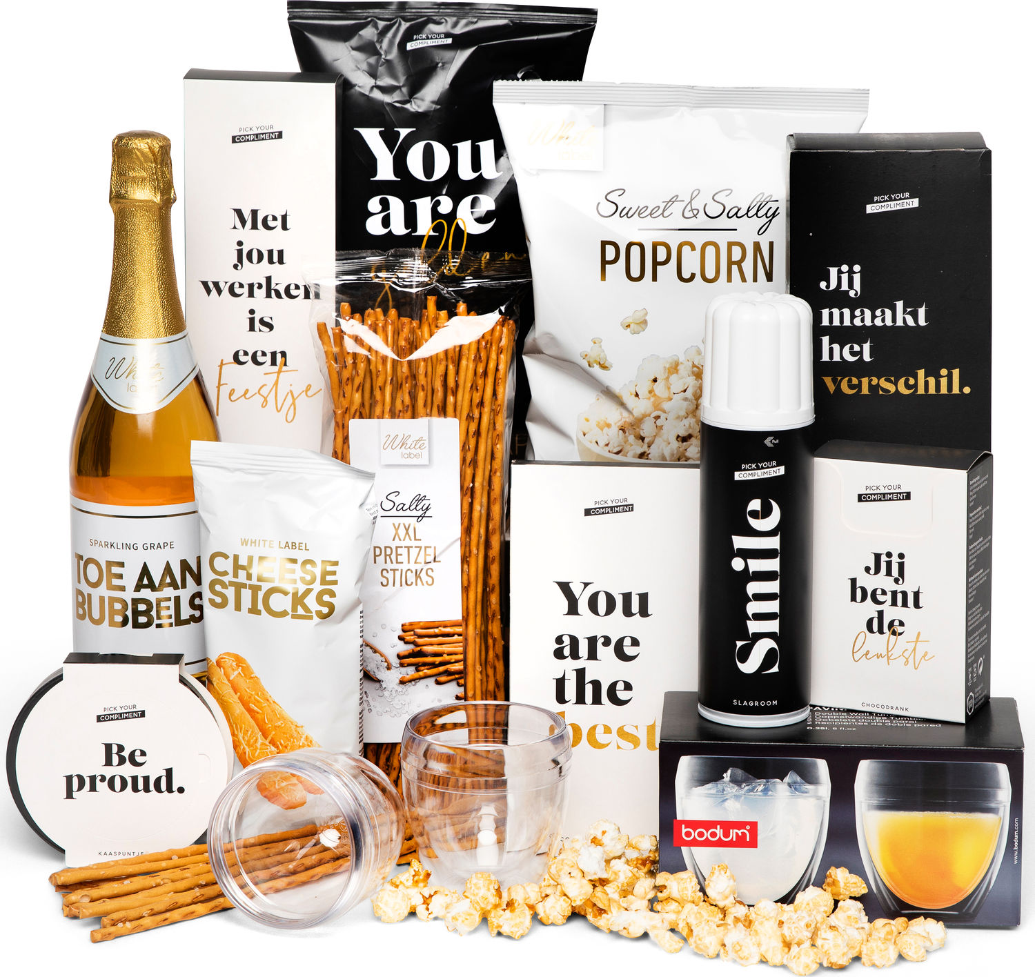Laat je betoveren door de tijdloze schoonheid van zwart, wit en goud en geniet van elke smaakvolle verrassing in dit complimenten kerstpakket. Dit pakket is voor mensen die positiviteit en waardering omarmen en genieten van kleine momenten. De twee stijlvolle dubbelwandige bekers van Bodum komen goed van pas, zowel voor frisdrank, koffie, thee, maar ook voor chocomel met slagroom.