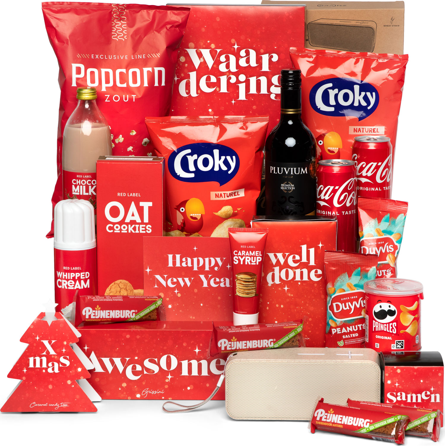 Deze feestelijke geschenkdoos is de ultieme traktatie voor iedereen die van een verrassing houdt tijdens de kerstperiode. De doos is gevuld met een gevarieerde selectie van snacks en drankjes in een vrolijke, rode verpakking, perfect om te delen met vrienden en familie. Met een mix van hartige en zoete lekkernijen biedt deze doos voor elk wat wils, idealiter voor gezellige momenten samen. Of het nu voor een feestelijke bijeenkomst of een persoonlijke verwennerij is, deze doos voegt een extra vleugje plezier en smaak toe aan de feestdagen.