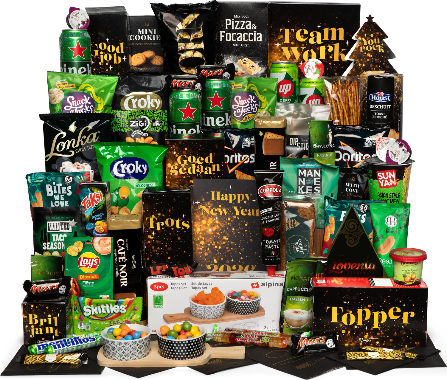 In deze feestelijke cadeauverpakking vind je een uitgebreide mix van heerlijke snacks en verwennerijen, perfect voor elke gelegenheid. Deze feestelijke set is zorgvuldig samengesteld en biedt een breed scala aan lekkernijen die de feeststemming verhogen. Of je nu wilt genieten van een knusse avond thuis of een speciale gelegenheid viert, deze pakket biedt voor ieder wat wils. Met een mix van zoete en hartige smaken is er genoeg te ontdekken en te delen. Het is een ideale keuze om indruk te maken op vrienden, familie of collega's met een ruim aanbod aan verleidelijke lekkernijen. Verwen jezelf of een ander met deze luxe set die garant staat voor vele genietmomenten.