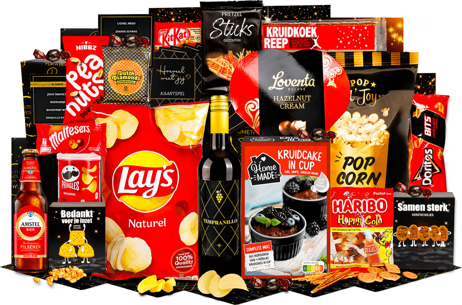- Kaartspel "Weet jij het?", Rode wijn, Tempranillo, 0,75ltr, Bier, Amstel, 0,33 ltr, Hartige zoutjes peper-zeezout, 60 gr, Pretzels, 40 gr, kruidcake in a cup, 280 gr, Koekreep, 110 gr, Chocolade hazelnoot pralines, 110 gr, Popcorn, 70 gr, Pinda's gezouten, 50 gr, Stroopwafel, 64 gr, 2 st, Kitkat, 41,5 gr, Haribo happy cola, 75 gr, Pringles original, 40 gr, Lay's chips naturel, 100 gr, Doritos bits twisties honey bbq, 30 gr, Maltesers, 37 gr, Kerstkoekjes, 80 gr, Verpakt in feestelijke kerstdoos39 x 29 x 12,6 cm