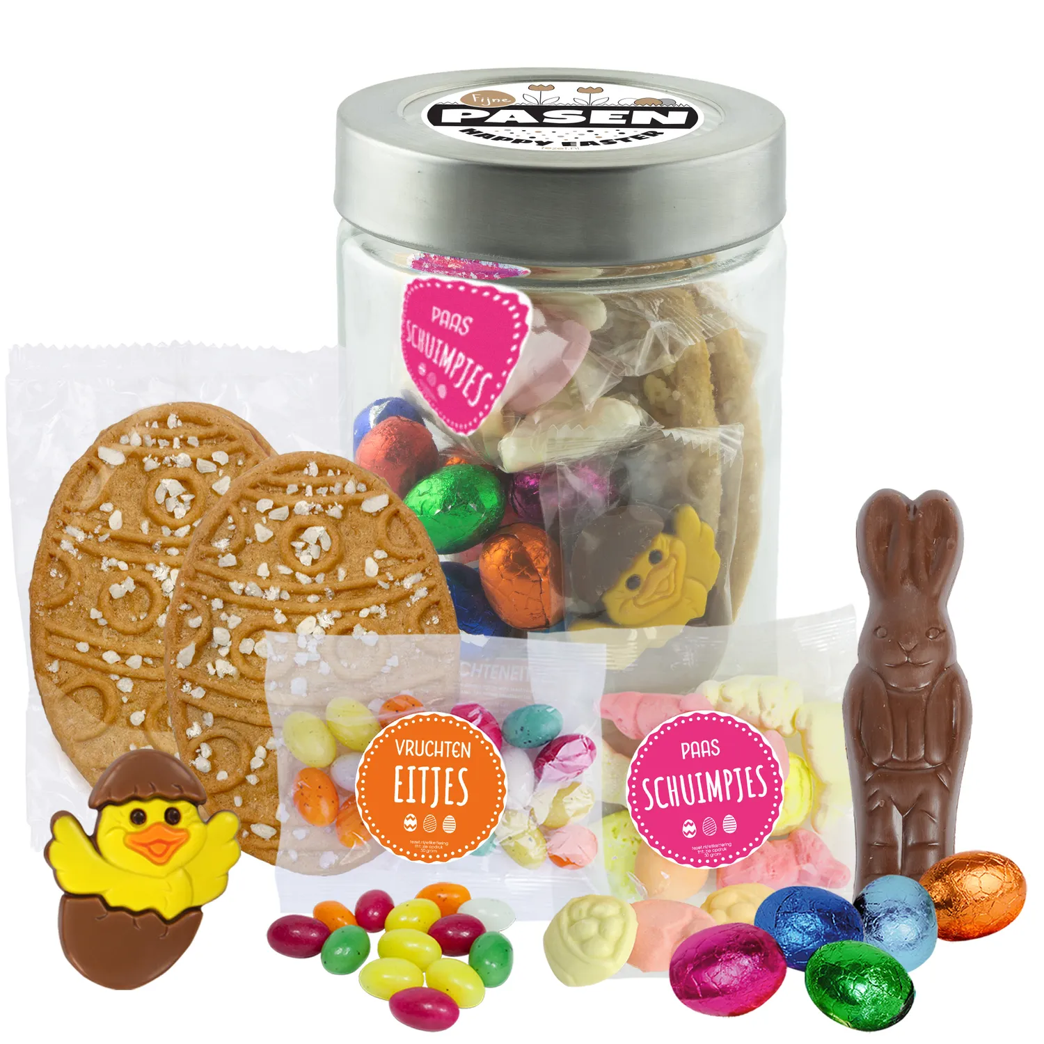 Mooie, glazen voorraadpot (hoogte ca. 17 cm, Ø 11 cm, 1200 ml) met zilveren/glazen deksel met inhoud en standaard Paasetiket. Gevuld met: