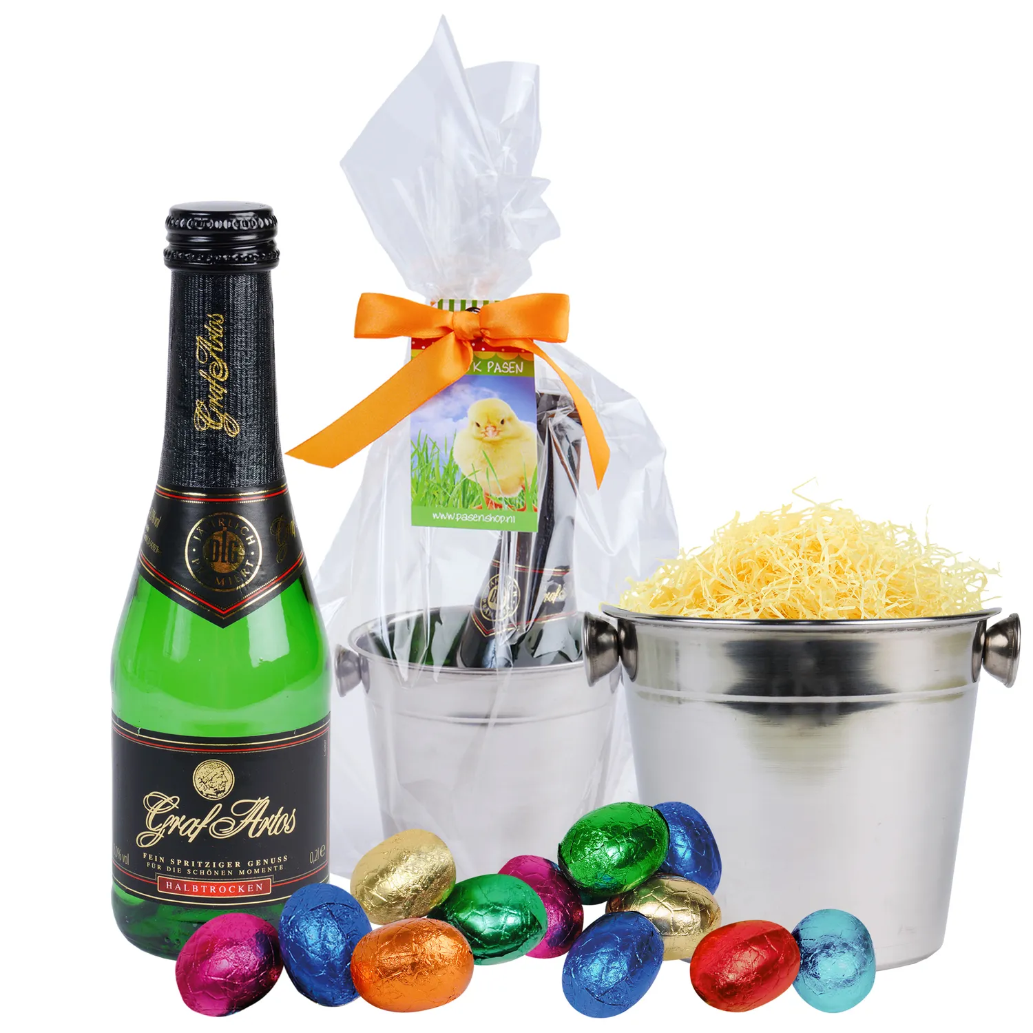 Leuk RVS ijsemmertje (12,5 x 10 cm) verpakt in transparant cellofaan met strik en standaard Paaslabel. Gevuld met: