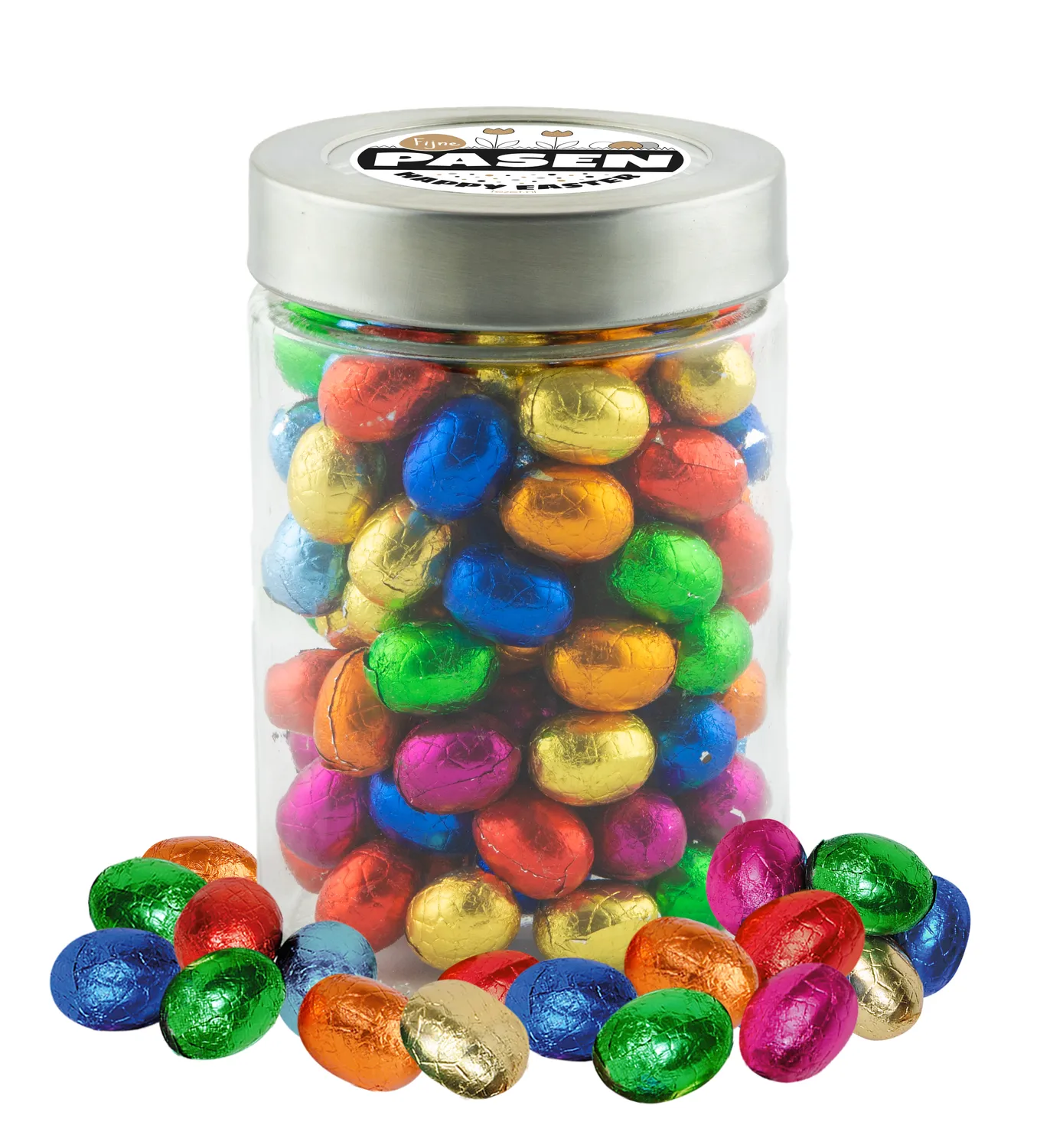 Mooie, glazen voorraadpot (hoogte ca. 17 cm, Ø 11 cm, 1200 ml) met zilveren/glazen deksel met inhoud en standaard Paasetiket.
