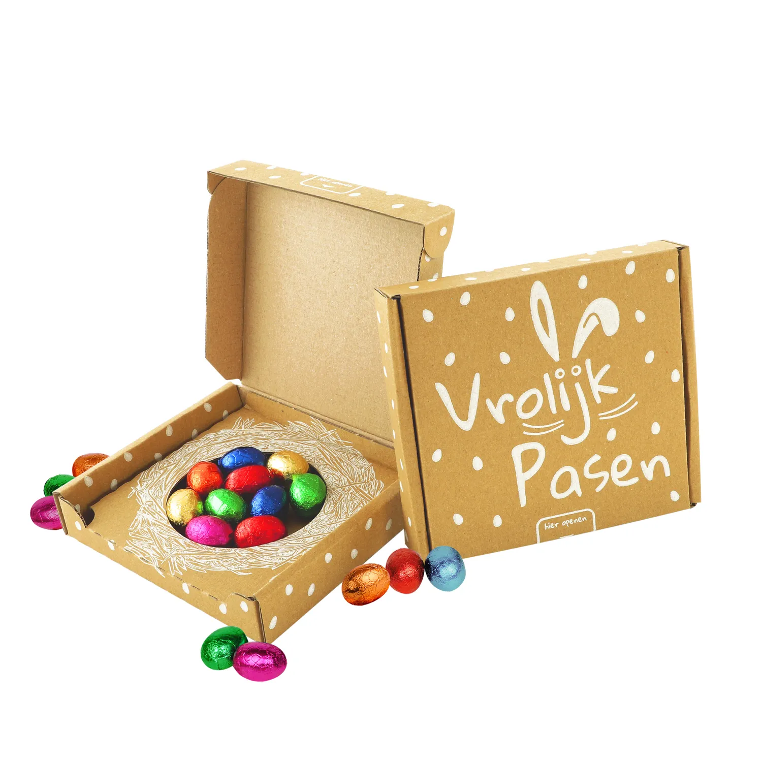 Pasen door de brievenbus! Dit paasnestje bevat 10 paaseitjes (een mix van 7 smaken). Afmetingen doosje: 14,5 x 13,5 x 3 cm. Alle chocolade is UTZ certified.