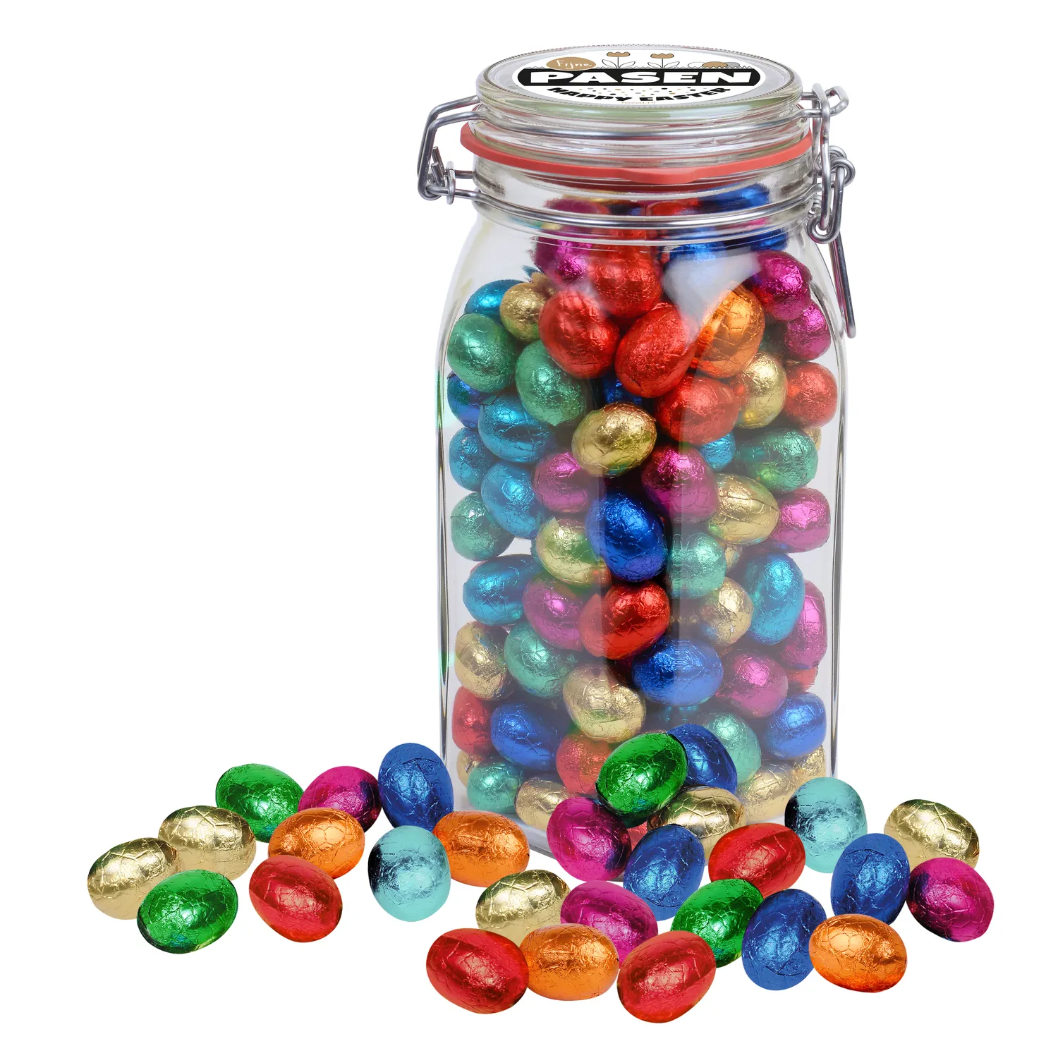 Mooie grote glazen weckpot (hoogte ca. 22,5 cm, Ø 10 cm, 1.550 ml) met deksel en rubberen afsluitring met standaard Paasetiket, gevuld met: