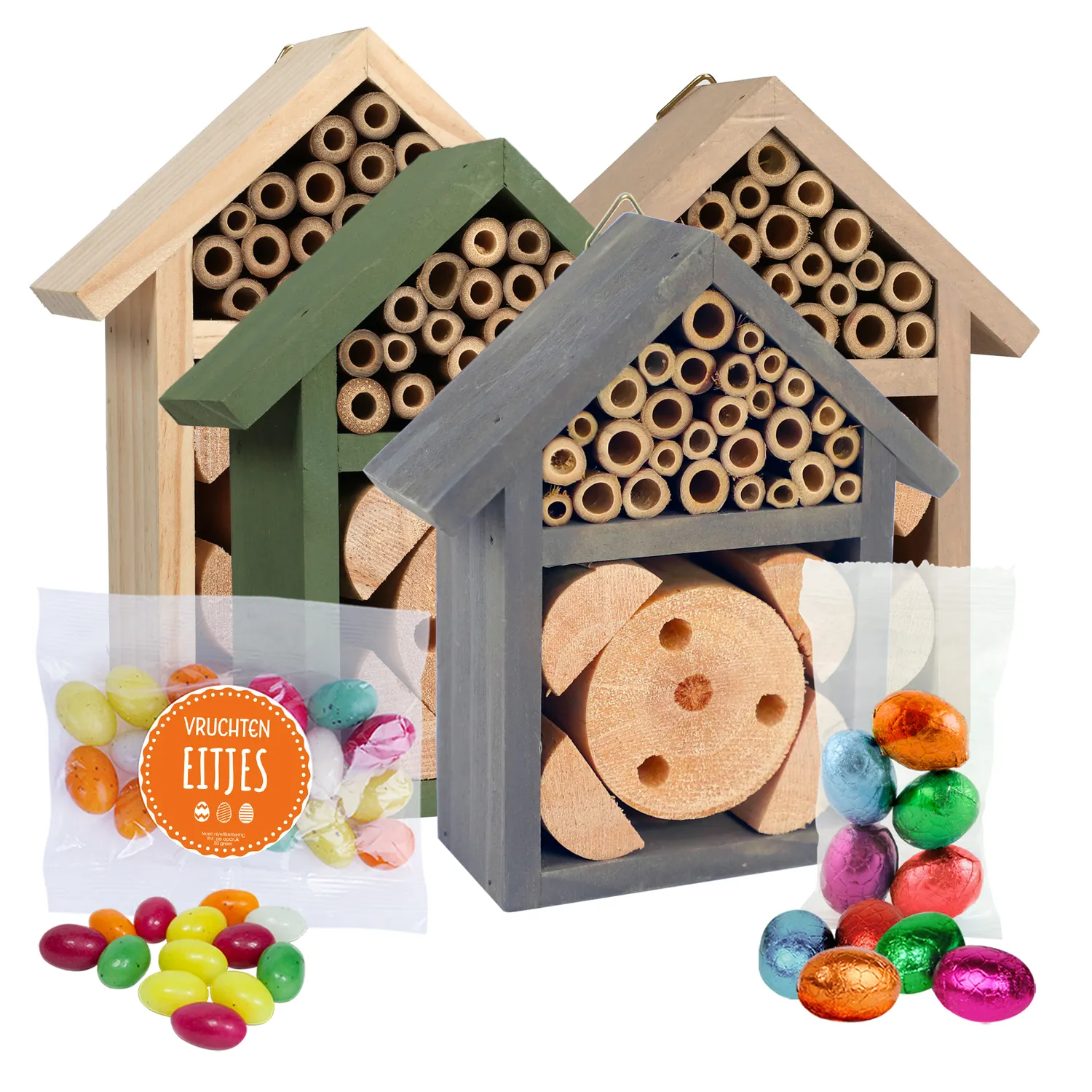 Leuk insectenhotel(letje) (hoogte ca.13 x 15 x 5 cm, assorti kleuren) verpakt in transparante cellofaan met Paasetiket gevuld met: