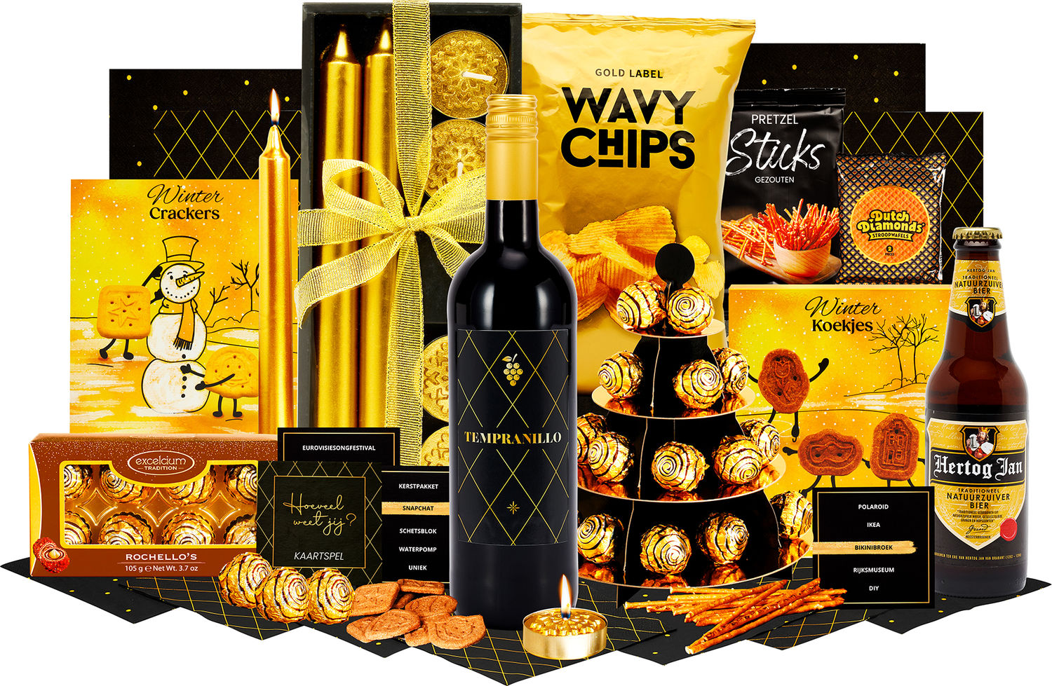 - Geschenkdoos met strik, 21 x 8,5 x 4 cm, Dinerkaarsen, 20 cm, 2 st, waxines, 4 st, Etagere Ø 20 cm, Kaartspel "Weet jij het?", Servetten, 8 st, Rode wijn, Tempranillo, 0,75ltr, Bier, Hertog Jan, 0,30 ltr, Hartige zoutjes peper-zeezout, 60 gr, Pretzels, 40 gr, Richello's, 8 st, 100 gr, Stroopwafel, 64 gr, 2 st, Ribbelchips, 90 gr, Kerstkoekjes, 80 gr, Verpakt in feestelijke kerstdoos 39 x 29 x 12,6 cm