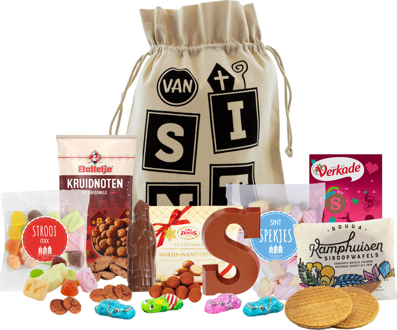 - Origineel bedrukte katoenen zak (25 x 35 cm) gevuld met: