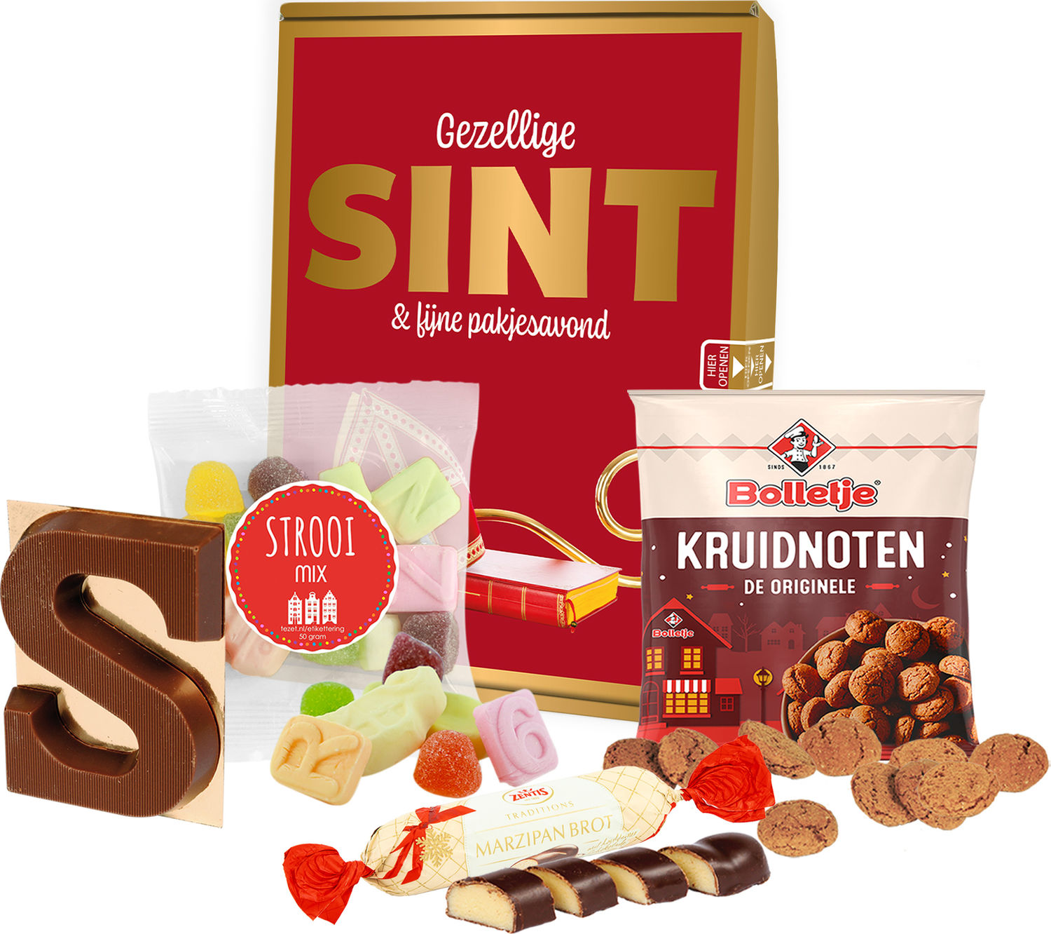 - Origineel bedrukt Sint brievenbusdoosje (21 x 15 x 2,5 cm) gevuld met: