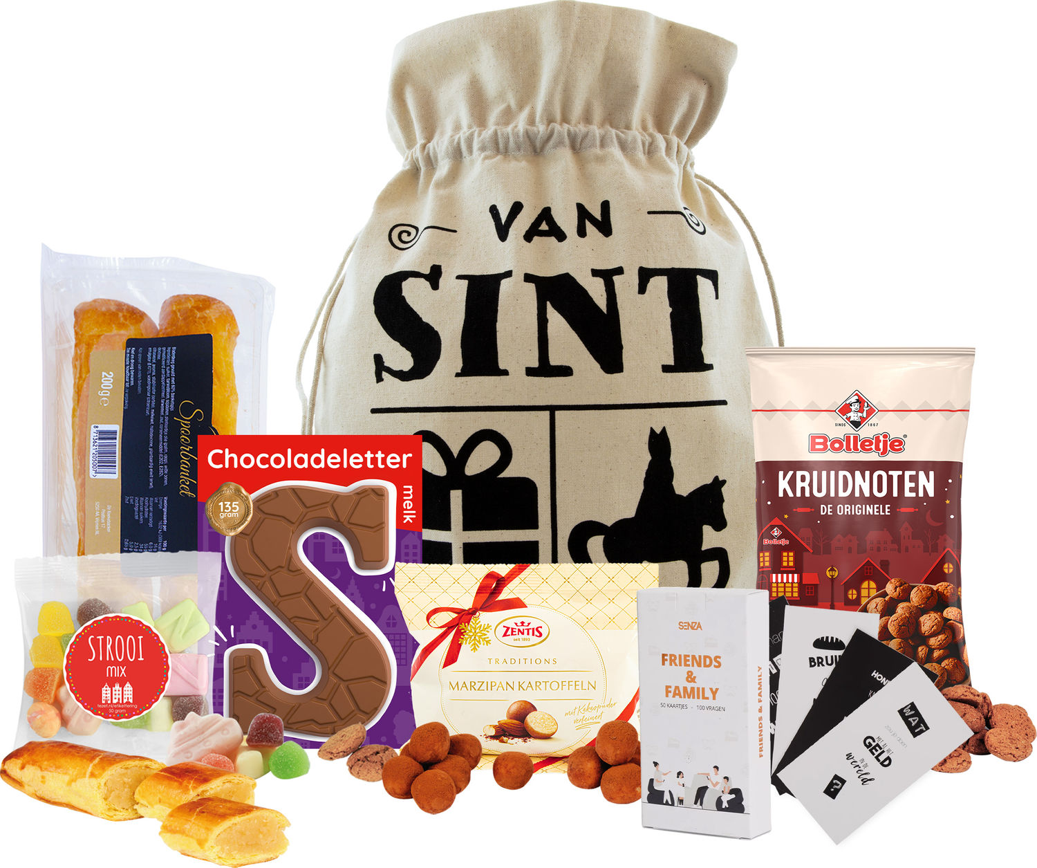 - Origineel bedrukte katoenen zak (30 x 40 cm) gevuld met: