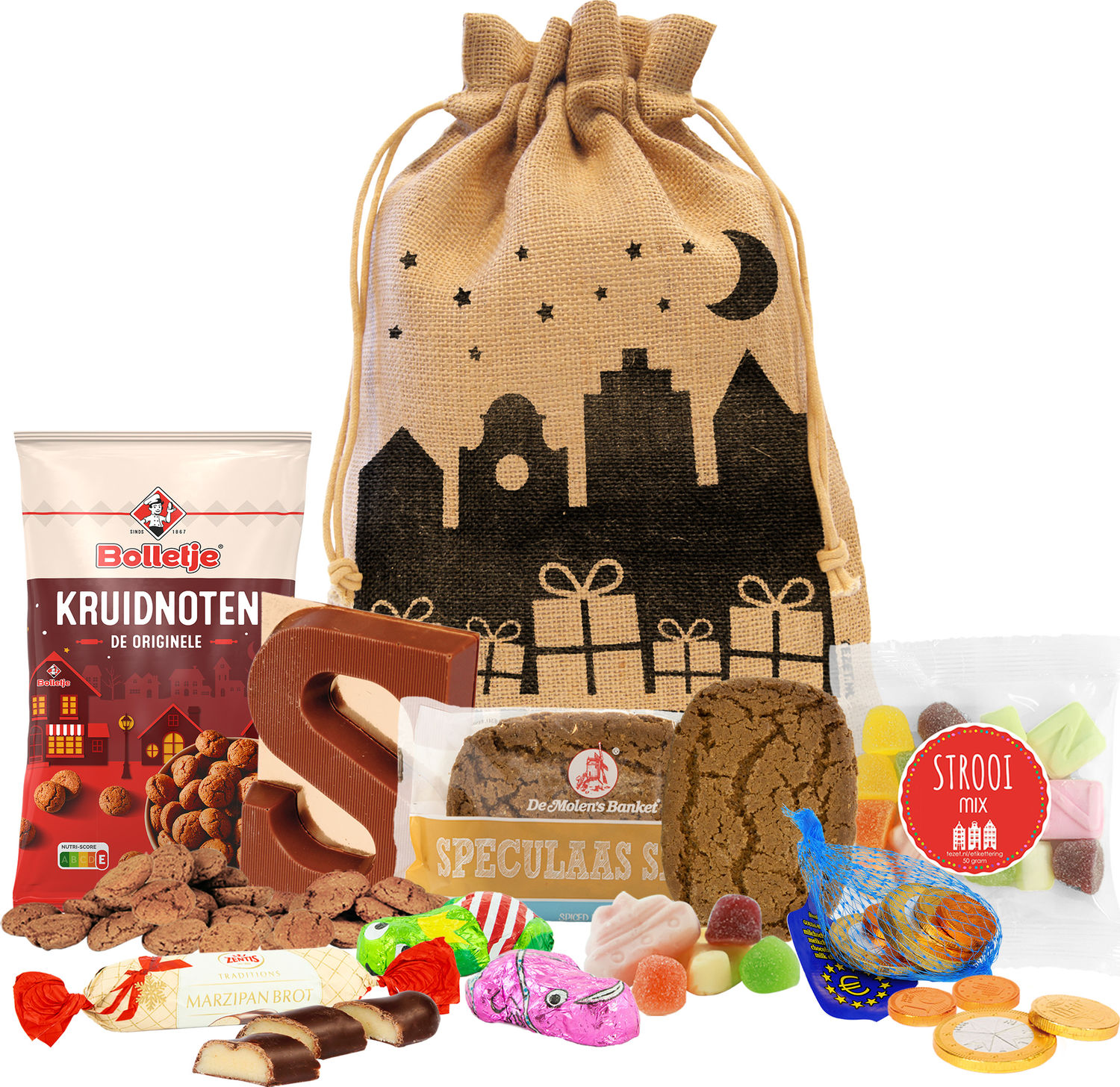 - Origineel bedrukte jute zak (25 x 35 cm) gevuld met: