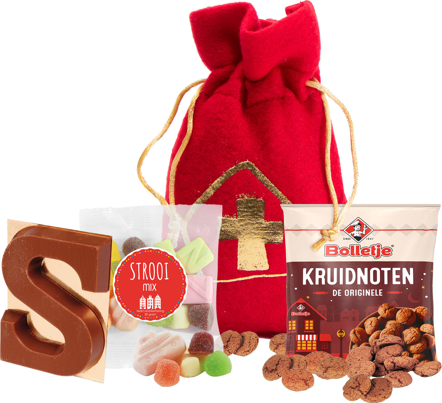 - Luxe Sint fleece zakje met gouden print ( 22 x 15 cm) gevuld met: