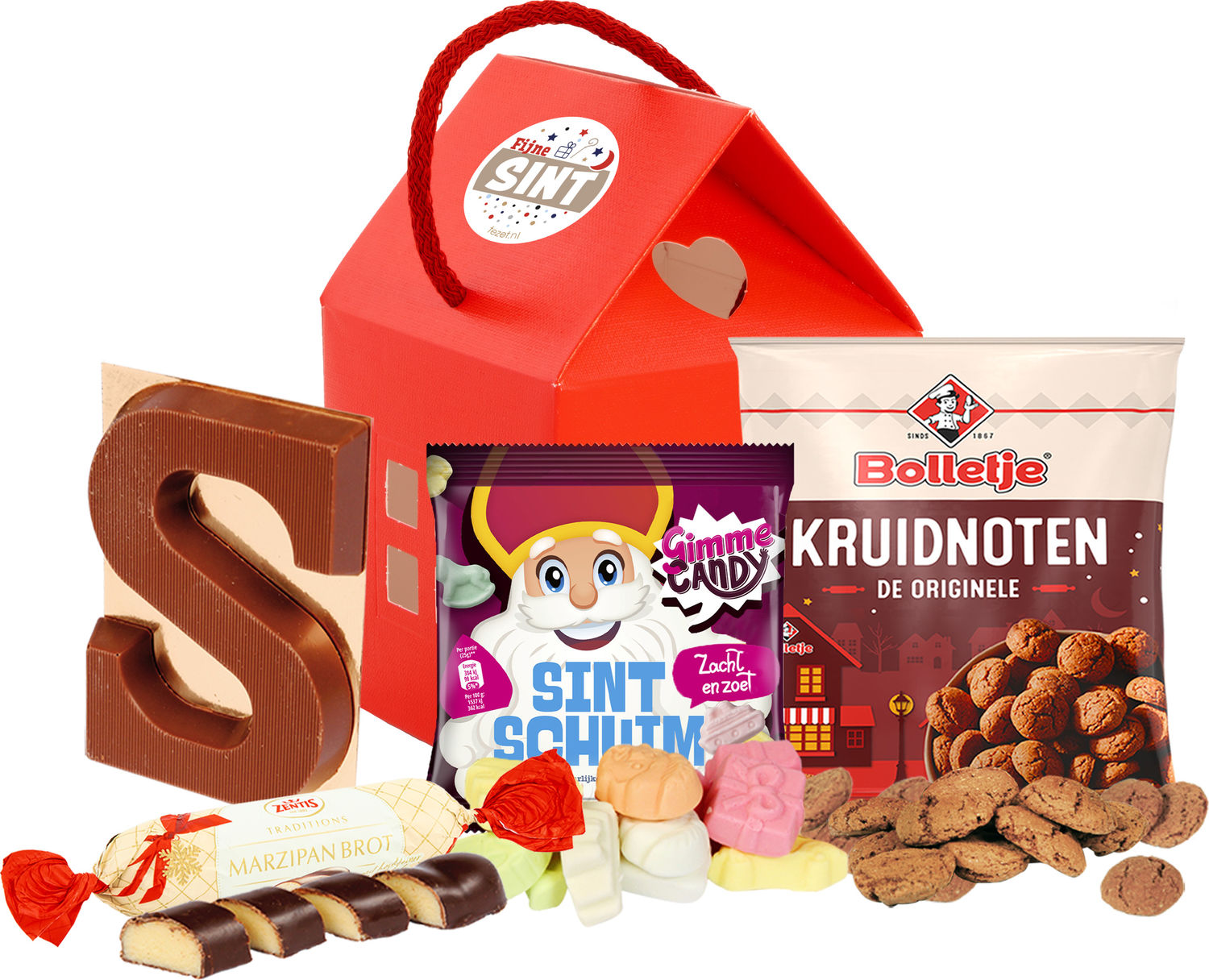 - Origineel rood kartonnen geschenkhuisje (hoogte 15 cm) met inhoud en Sintetiket