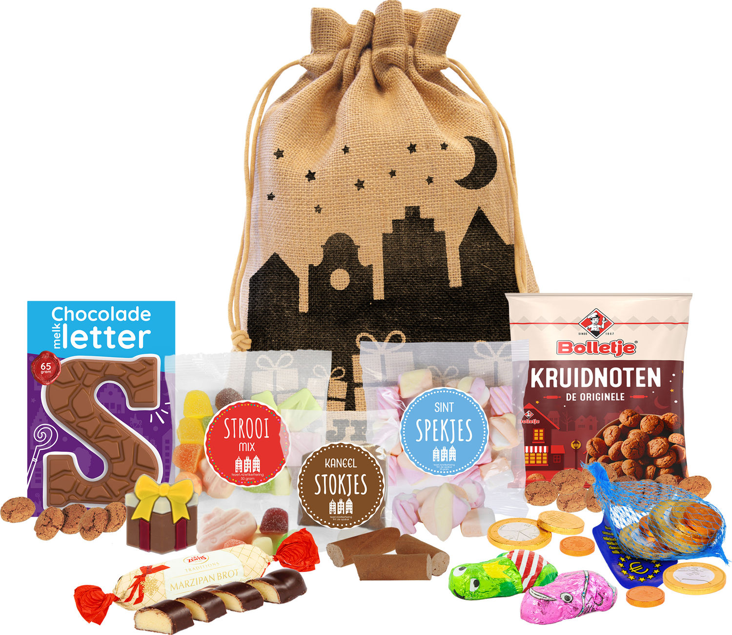 - Origineel bedrukte jute zak (25 x 35 cm) gevuld met: