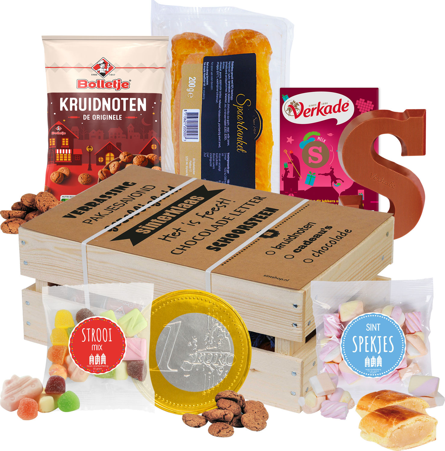 - Leuk houten kistje (29 x 19 x 11 cm) met Sinttekst inlay gevuld met: